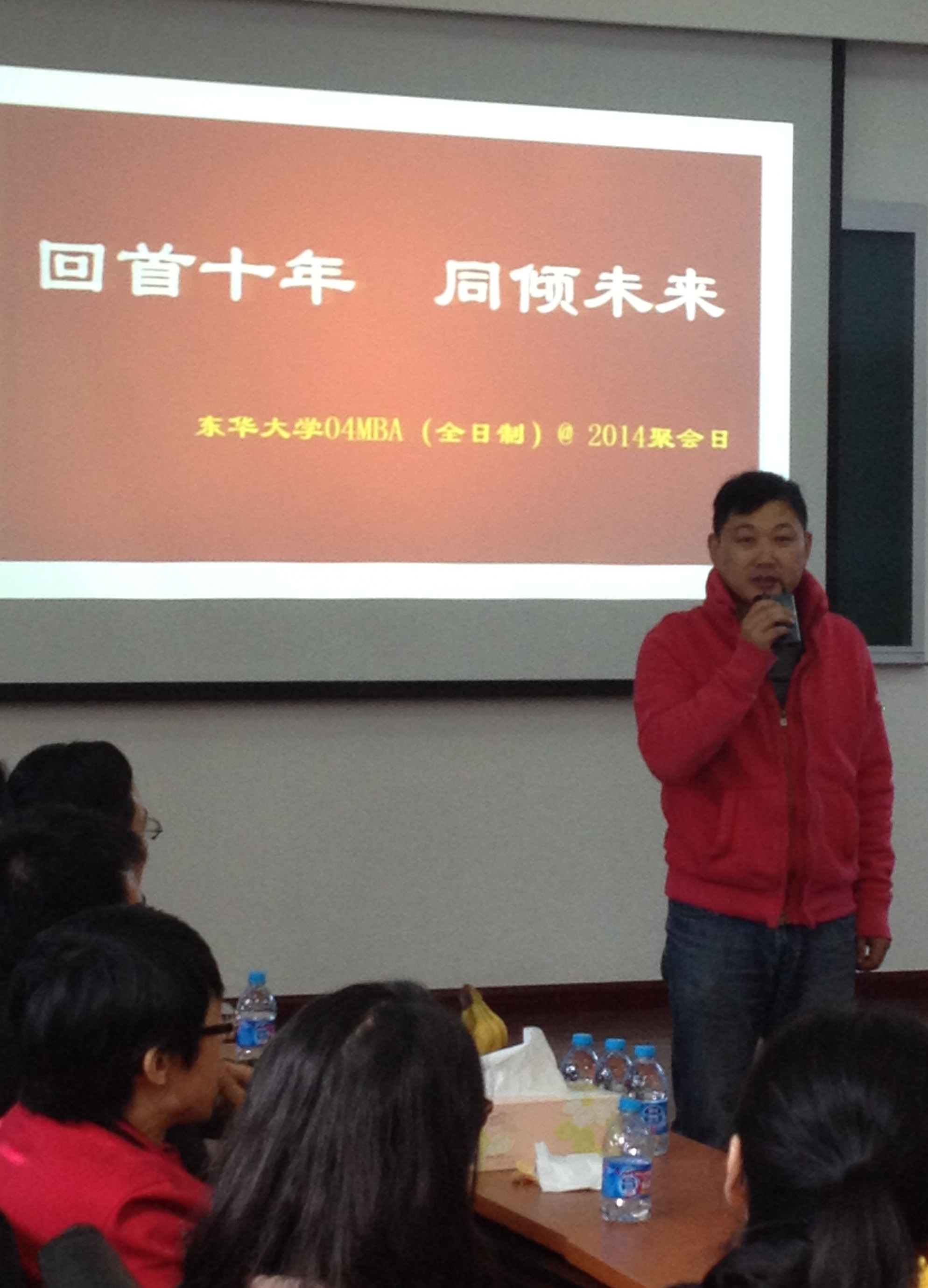 2014年11月15日星期六9:30,旭日楼100教室,04MBA(全日制)1班和2班举行了一场隆重的同学聚会。此次聚会由两个班的班长牵头带领,并由东华大学澳門漁人码头 校友会协助举办,共同纪念同学十年友谊,并携手共迎未来。出席此次活动的嘉宾包括澳門漁人码头 副院长沈蕾教授,澳門漁人码头 校友会秘书长梁传标,副秘书长王磊,以及各班级MBA学生。