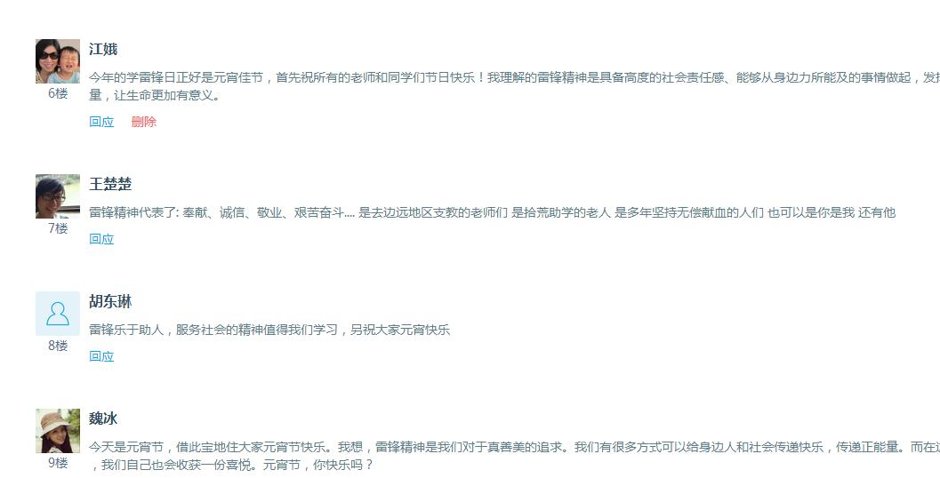 活动开始不到1小时,就有超过10位老师和同学们发表评论,说出自己对于雷锋精神的理解。 有同学说雷锋精神就是高度的社会责任感,有同学说到了去边远山区支教的故事,有同学说雷锋精神从身边的小事和点滴做起……通过在公共平台的讨论,同学们不但可以对自己理解的雷锋精神畅所欲言,也可以学习和讨论其他师生理解的雷锋精神,从而让自己的思维更为开阔,对雷锋精神的理解更为全面。