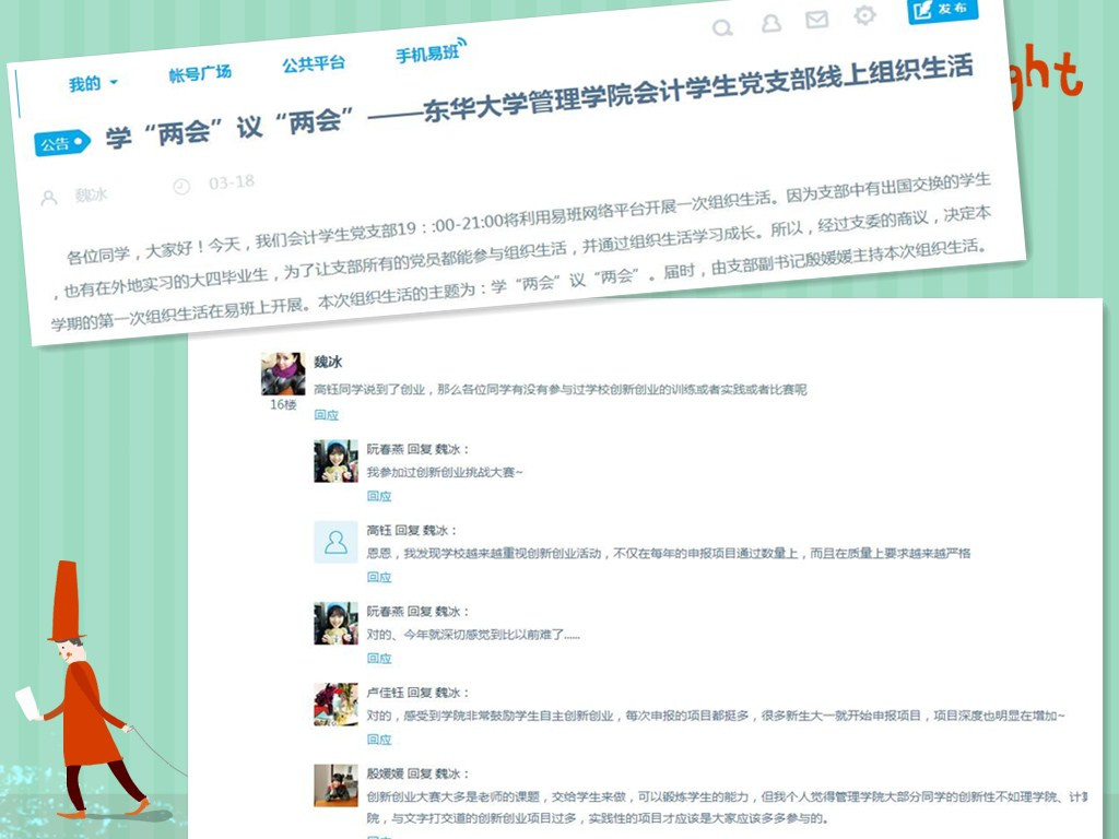 晚上七点整,易班线上组织生活正式开始,我们会计支部的学生党员在魏冰老师的带领下围绕“两会”展开学习和讨论,发表自己关于本次两会的学习感想。首先高钰同学发表了自己对习近平总书记对于改革创新议题讲话和两会期间上海代表团大力讨论建立“全球科创中心”的看法。结合其看到的身边的新闻,高钰同学提出创新的思维应该从小培养,从教育下手辅以环境支持,双向主动才能促成创新更好发展,从而带动创业,乃至就业的发展。围绕这个话题,魏冰老师向党员同学们提问,是否参与了澳門漁人码头 创新创业大赛,不少党员给予答复,并深切感受到澳門漁人码头 对创新创业活动的重视程度逐年加强,申报项目的数目和质量都愈发严格把关,另一方面澳門漁人码头 也非常鼓励学生自主创新创业,许多同学从大一就开始申报项目了。校内浓郁的创新创业氛围为原先不敢表达自己思维想法的同学们提供了自信和动力,让同学们敢于在这些创新创业类大赛中将自己的想法付诸于行动。接着陶斯彤同学又提到加强规范立法,引出近来热议的柴静的“穹顶之下”披露的中国在环保方面立法模糊,同时吴子肖同学也提到李克强总理指出雾霾已成当务之急,两会期间环保议题受到了前所未有的高度重视,引发了其他党员的热议。党员不仅结合自己的实际生活谈到雾霾的影响,而且纷纷表示,只有加强立法,规范法律制度,才能更有效控制环境恶化,乃至实现中国梦。此外,俞洋同学谈到了全国正在面对的老龄化问题,并与崔笛同学结合自己国外交换的留学经历分享国外处理老龄化问题的措施,真知灼见让党员们开阔了视野,也得到了党员们的热烈回应。还有延长妇女产假的问题,反腐问题等等,每位党员都分享了自己关注两会并深入了解的热门话题,展开话题的同时给出了自己对此的独到见解,并引发党员们的热议。