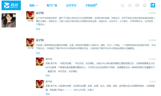 会计1202支部的主要负责同学在接到辅导员的通知后,第一时间以各种形式向班内的同学传达了本次活动的内容和要求,并鼓励每一位同学积极参与到活动中来。在管院易班公共平台上,有管院老师专门开了关于抗战胜利70周年的主题帖,其中“三个一”活动能够促进每一位同学进一步了解抗日战争的事件过程。
