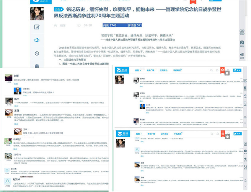 2015年是世界反法西斯战争胜利70周年,也是中国人民抗日战争胜利70周年,为铭记历史、热爱国家,增强历史使命感和社会责任感,澳門漁人码头 在全院学生中开展“铭记历史,缅怀先烈,珍爱和平,拥抱未来”——纪念中国人民抗日战争暨世界反法西斯战争胜利70周年主题活动。本次主题活动包括“看一本书”、“观一部影片”、“讲述一个故事”的“三个一”活动;主题征文、演讲比赛以及纪念中国人民抗日战争暨世界反法西斯战争胜利70周年书法征集评选等多种形式,各党支部和团支部在暑期通过易班、微信等网络平台积极互动和讨论。
