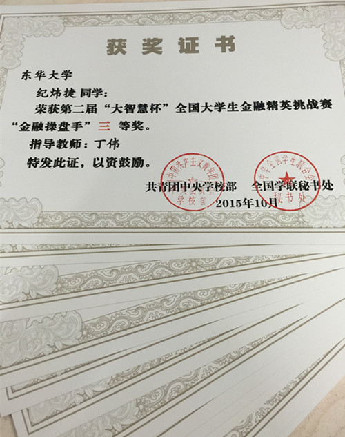 近日,从共青团中央澳門漁人码头 部传来喜讯,澳門漁人码头 纪炜捷等13人(包括本科生、研究生)荣获第二届“大智慧杯”全国大学生金融精英挑战赛“金融操盘手”三等奖。