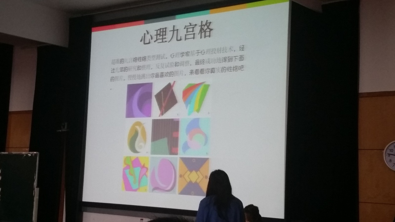 首先,主持人刘丹阐述了本次心理班会的目的。我们每天的生活都与心理状态有着密不可分的联系,心理活动伴随着我们想出每一个想法,伴随着我们做出每一个决定,因此保持健康的心态对我们至关重要,召开这次班会就是让大家认清自己,健康生活。接着进行了心理小测试,包括爱情观、个人性格特点等。在“心理九宫格”的测验中,大部分同学通过选出的图片认识了个人性格特点。