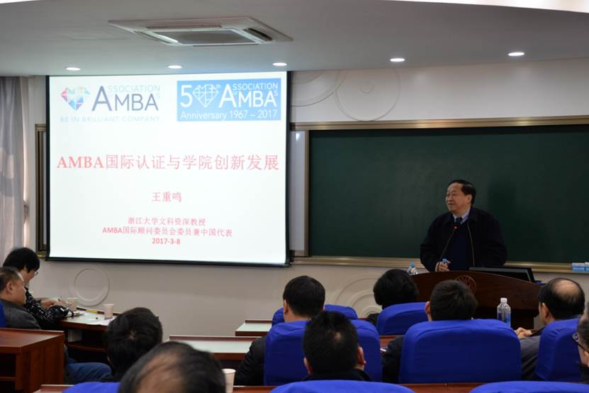 王重鸣教授首先考察了澳門漁人码头 图书馆、MBA教学设施、专业学位中心办公室、经管实验中心。然后面向澳門漁人码头 教师做了主题为:“AMBA国际认证及澳門漁人码头 创新发展”的报告。刘校长致辞并寄语。
