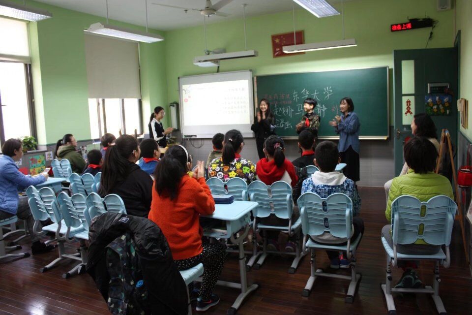 针对聋校学生低年级听力稍强,但是理解能力较差、高年级听力较弱,理解能力稍强的情况,志愿者因地制宜,分为两组,分别进行不同的教学内容。为更好的展开授课,志愿者通过询问名字、分发糖果的形式拉近和聋校同学关系。其后,志愿者们进行自我介绍,将“东华大学”和自己的名字写在黑板上,加深同学们印象,同时播放PPT,正式开始上课。