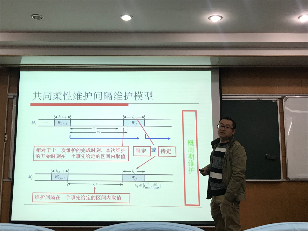 徐教授用幽默诙谐地自我介绍将在座的师生带入他生动精彩的报告中。报告的重点内容是生产调度问题的相关研究,对于生产调度问题的研究现状有了进一步地阐释,针对集成调度问题,他深层次地介绍其优点在于能够把车间内机器的运行和维护结合起来考虑并且制定科学合理的生产计划。除此之外,徐教授系统性地梳理了确定性维护的类型,逻辑清晰、思维缜密。报告的最后,徐教授对他的最新研究成果做了简要的介绍并提出新的研究思路,在座的师生对其前沿的研究思想啧啧称叹并纷纷向徐教授请教相关问题。