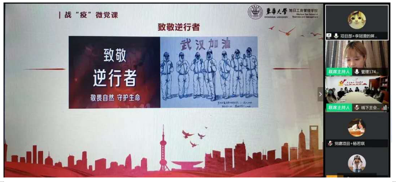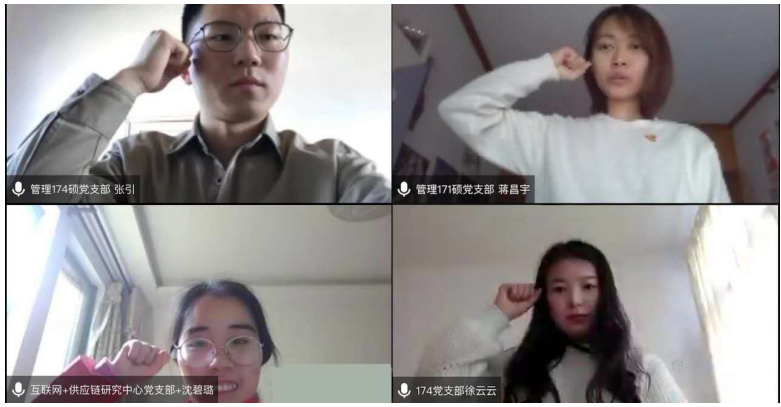 全体党员郑重佩戴党徽,随后音乐响起,大家全体起立,齐唱《国际歌》。随后全体党员观看了回顾视频,重温入党的历程。观看视频后,各党支部优秀党员代表进行发言,从不同的角度,以战“疫”微党课的形式分享了自己在毕业之际的感言。管理171硕党支部戴云龙、管理172硕党支部李鹏飞、管理173硕党支部董晨光、管理174硕党支部吴丹、大数据与算法研究中心党支部沈静、互联网+供应链研究中心党支部吴仪等同学进行了交流分享,他们深入浅出地讲述了自己作为一名党员在疫情之下对于生活各个方面的思考。离校之际,澳門漁人码头 党委副书记丁怡老师亲切寄语,鼓励毕业生党员们牢记自己的规划和目标,脚踏实地乐观面对并战胜困难,为社会贡献出自己的一份力量。澳門漁人码头 学生工作办公室主任王丽华老师和研究生教学秘书何帅老师也通过音视频的形式为毕业生党员们献上美好祝福。