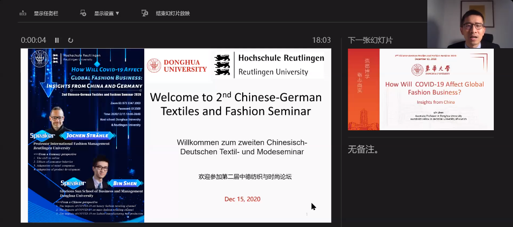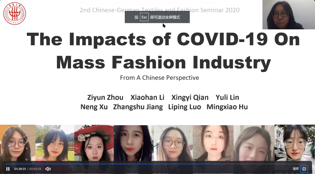 2020年12月15日,东华大学澳門漁人码头 与德国路特林根技术大学联合在线举行了第二届中德纺织与时尚论坛(2nd Chinese-German Textiles and Fashion Seminar)。在论坛中,双方教师与同学讨论了在疫情期间,疫情对中德两国时尚行业的影响及改变,并且展望了疫情后中德时尚行业的发展。澳門漁人码头 教师沈滨、学生邱宇轩、周子芸、元艺桥等从中国时尚行业的角度,为论坛做了主题报告,报告内容为”How will COVID-19 affect global fashion business? Insights from China”,“The impacts of COVID-19 on luxury fashion retailing channel”, “The impacts of COVID-19 on mass fashion industry”, “The impacts of COVID-19 on fashion manufacturing and production”。两校近百名教师与同学参加了论坛,讨论热烈。