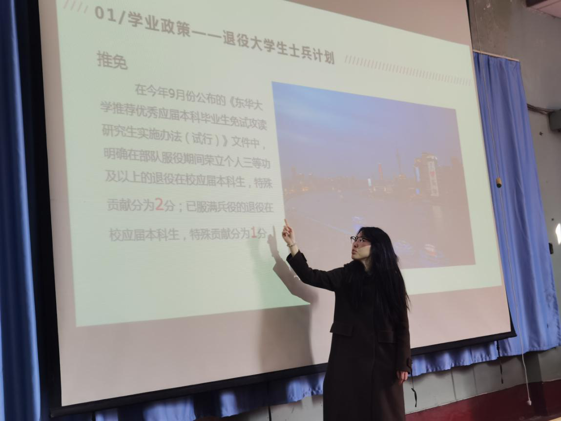 会上,徐欣怡老师就应征入伍大学生的学业政策、落户政策、就业政策、毕业生提干、优待金政策及退伍回来后的发展前景等方面进行了详细介绍。