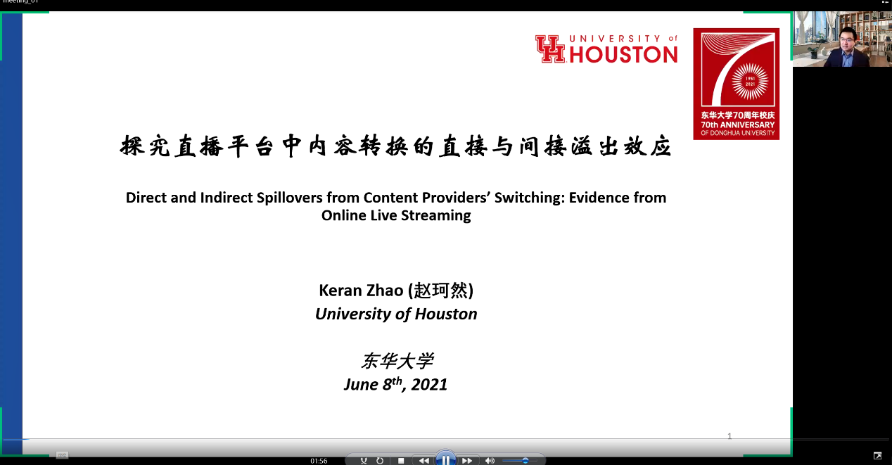 6月8日上午,美国休斯顿大学鲍尔商澳門漁人码头 决策与信息系统系赵珂然助理教授受邀来澳門漁人码头 做以“Direct and Indirect Spillovers from Content Providers’ Switching: Evidence from Online Live Streaming”为主题的学术讲座。旭日工商澳門漁人码头 的老师和同学们通过腾讯会议共同聆听了此次讲座,澳門漁人码头 沈滨老师主持。