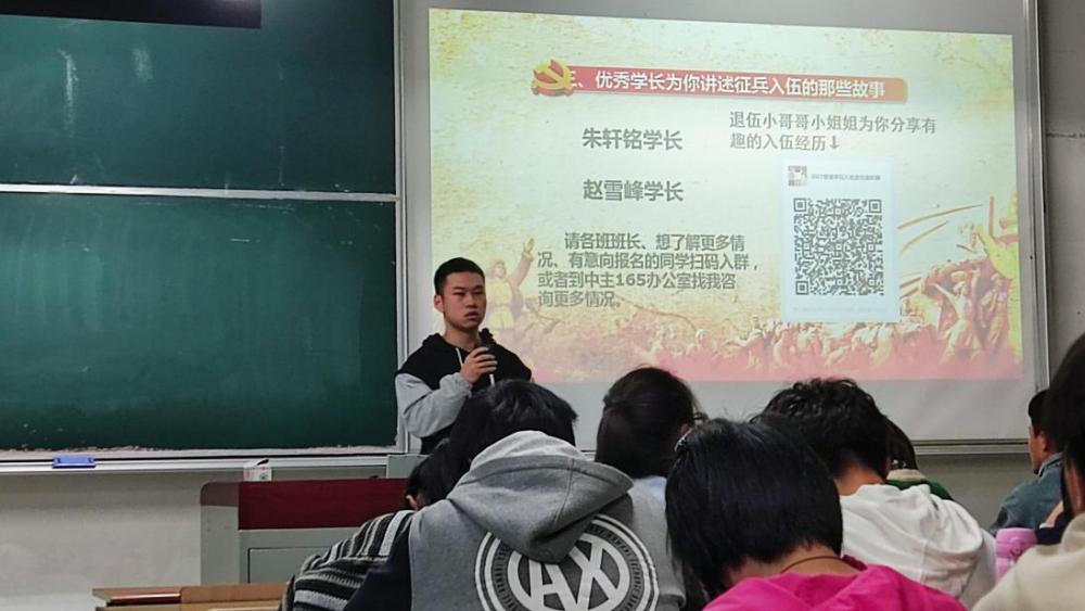 徐欣怡老师主要从国家需要、当代大学生入伍优势以及退伍学长学姐的故事三个方面作了精彩的政策解读与介绍分享,积极动员大学生应征入伍,激发学生们参军热情。