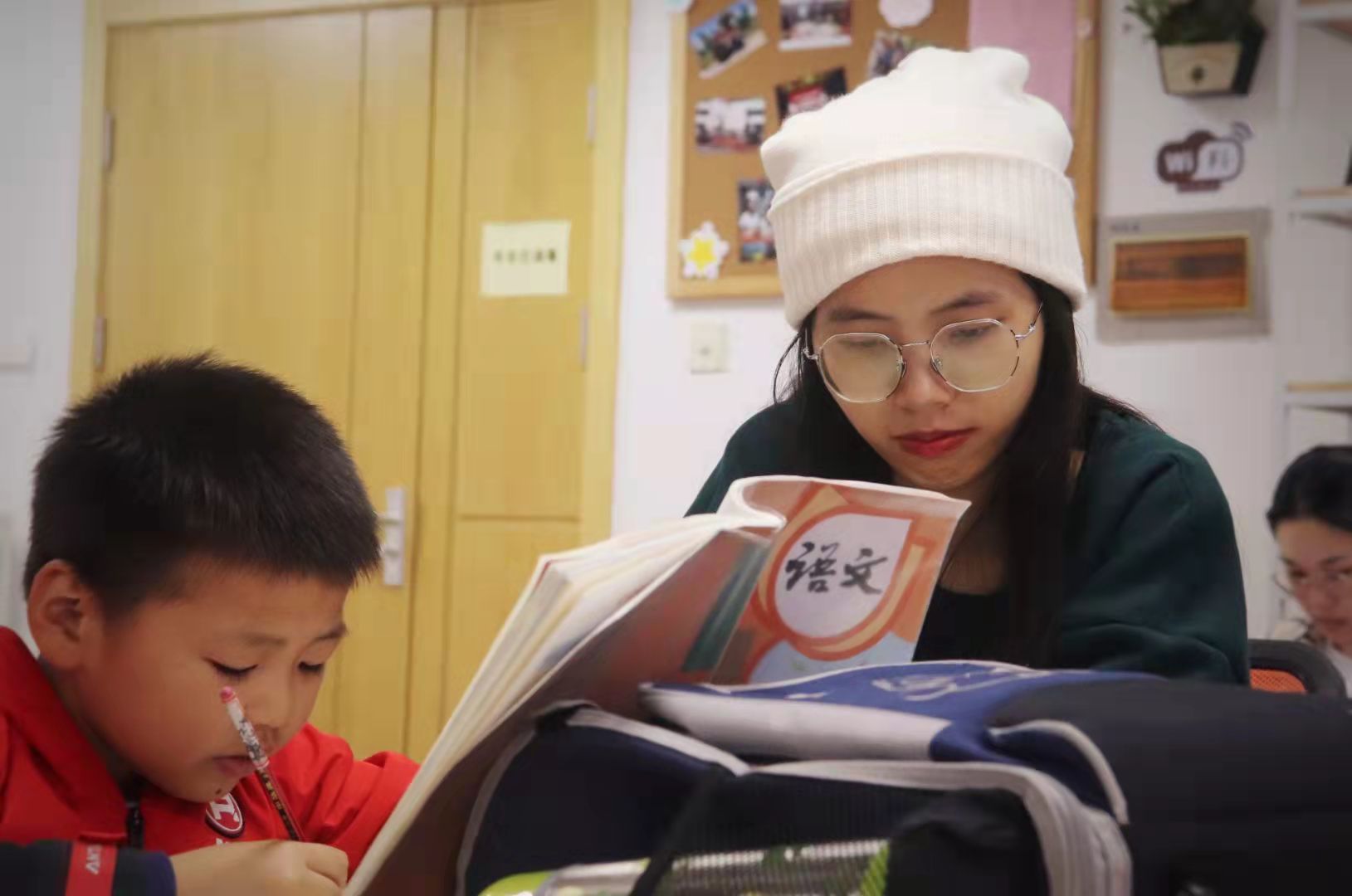 (志愿者辅导学生完成语文作业)
