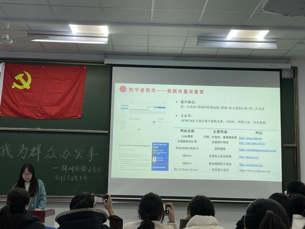 第二位进行经验分享的是保研至东华大学的田雨平同志。田雨平有着非常丰富的竞赛经验,她分享的重点在于各类竞赛。她介绍了数学建模类和创新创业类竞赛的基本情况和注意事项,并结合参赛经历向同学们推荐了众多高质量的数据收集网站。田雨平认为参加竞赛的过程是充满挑战的,需要敢于尝试,最终找到适合自己的方向。