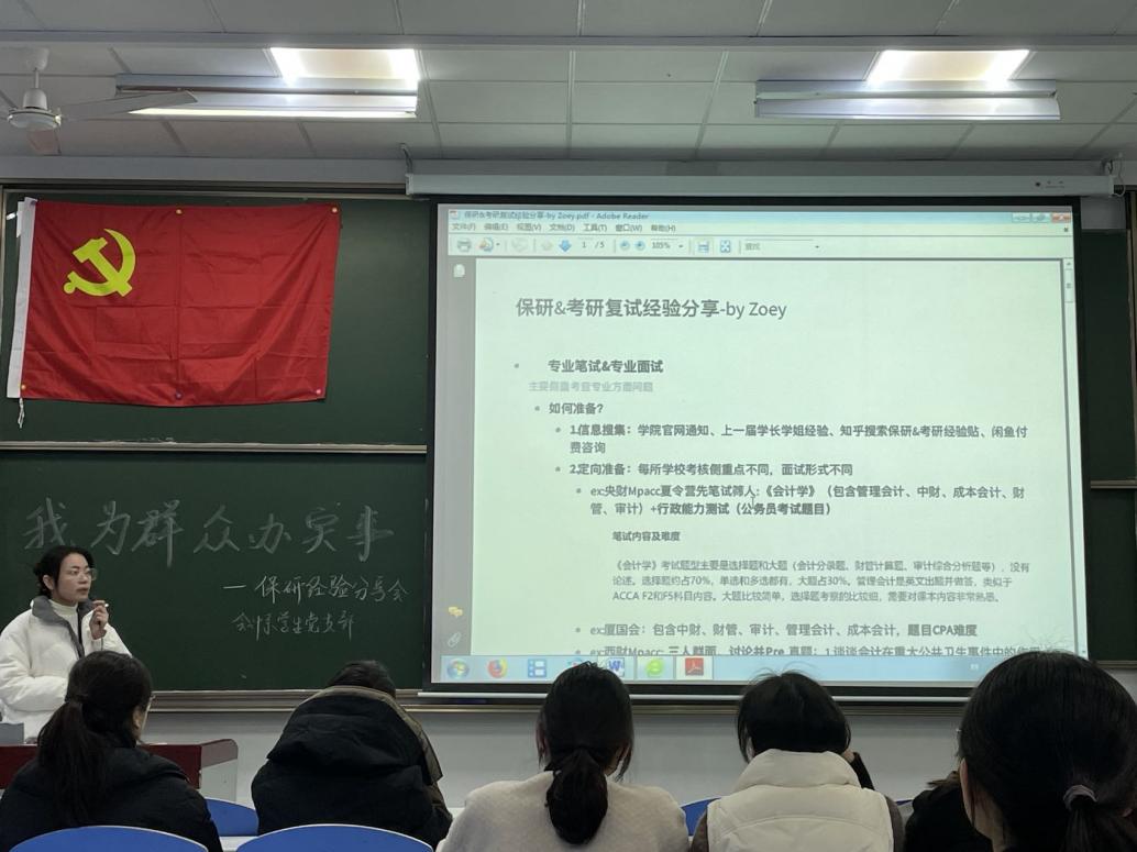 据悉,值此建党百年之际,为更好的落实“我为群众办实事”工作,会计系学生党支部先后举办了周公馆志愿服务、财会专业朋辈引领经验分享会等活动,尽支部所能帮助周围群众。而本次分享会内容丰富多元,与学习生活联系紧密,旨在为同学们提供关于保研的全面的经验分享,有助于同学们对自己未来的学习生活进行更好的规划。活动结束后,同学们纷纷表示,通过聆听分享会,切身感受到了先进党员的积极力量,获得了学习生活道路的建议和激励,并相信在优秀前辈的指引下,在个人的拼搏奋进中,大家能实现心中理想,成为对社会、对祖国更有用的人才!