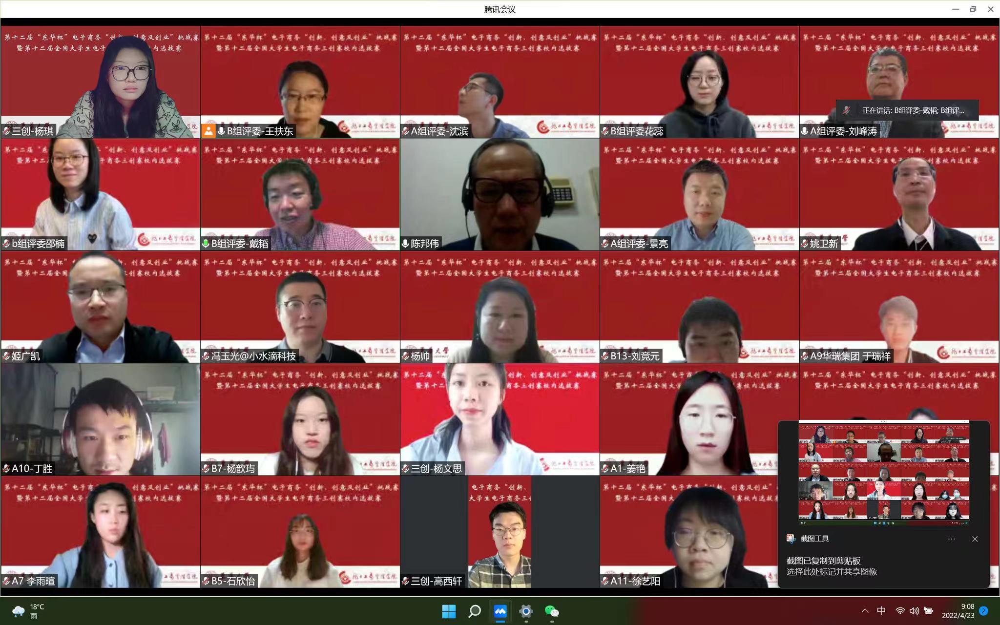 本次比赛28支参赛队伍分为A、B两组,于腾讯会议进行线上答辩。分别邀请到了冯玉光(组长),景亮,姬广凯,刘峰涛,沈滨;陈邦伟(组长),邵楠,戴韬,王扶东,花蕊。分别作为A、B两组的答辩评委。