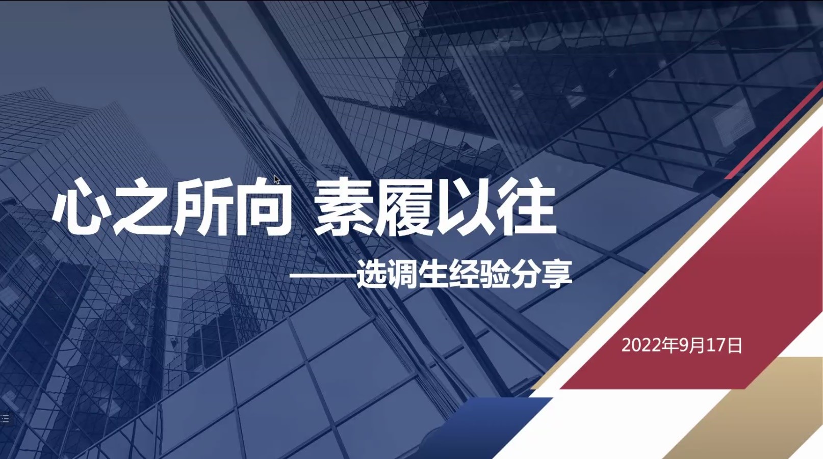 徐智坤毕业后就职于上海市人力资源和社会保障局,介绍了选调生的选调条件,选调流程和近年上海选调生的高校分布情况,帮助新生了解选调生竞争情况。随后,徐智坤分享了选调生备考经验,碎片化的时间可以利用来关注时事新闻和专家观点。