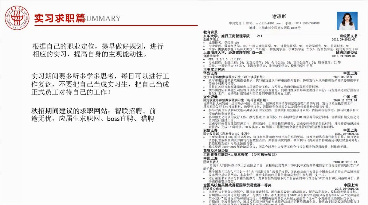 谢疏影毕业后任职于海通恒信管培生,从科研、考证和实习求职三方面进行分享。谢疏影强调主观能动性的重要性,同学们在科研时需要多和导师交流,不能等待导师下发任务,在实习时,也应当做好向上管理,每日复盘。