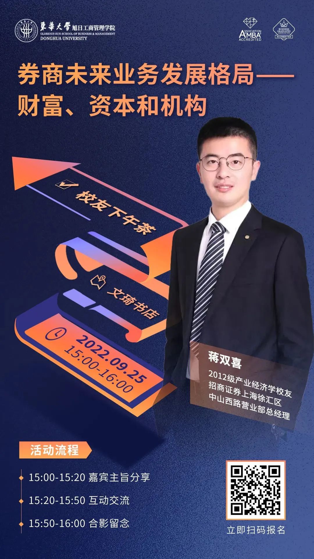毕业后的他曾就职于浦发银行上海长宁支行,担任客户经理的岗位。现就职于招商证券上海徐汇区中山西路营业部,担任营业部总经理岗位。蒋双喜学长是招商证券全国最年轻的营业部总经理,在金融行业从业七年,有着丰富的金融行业业务相关经验。