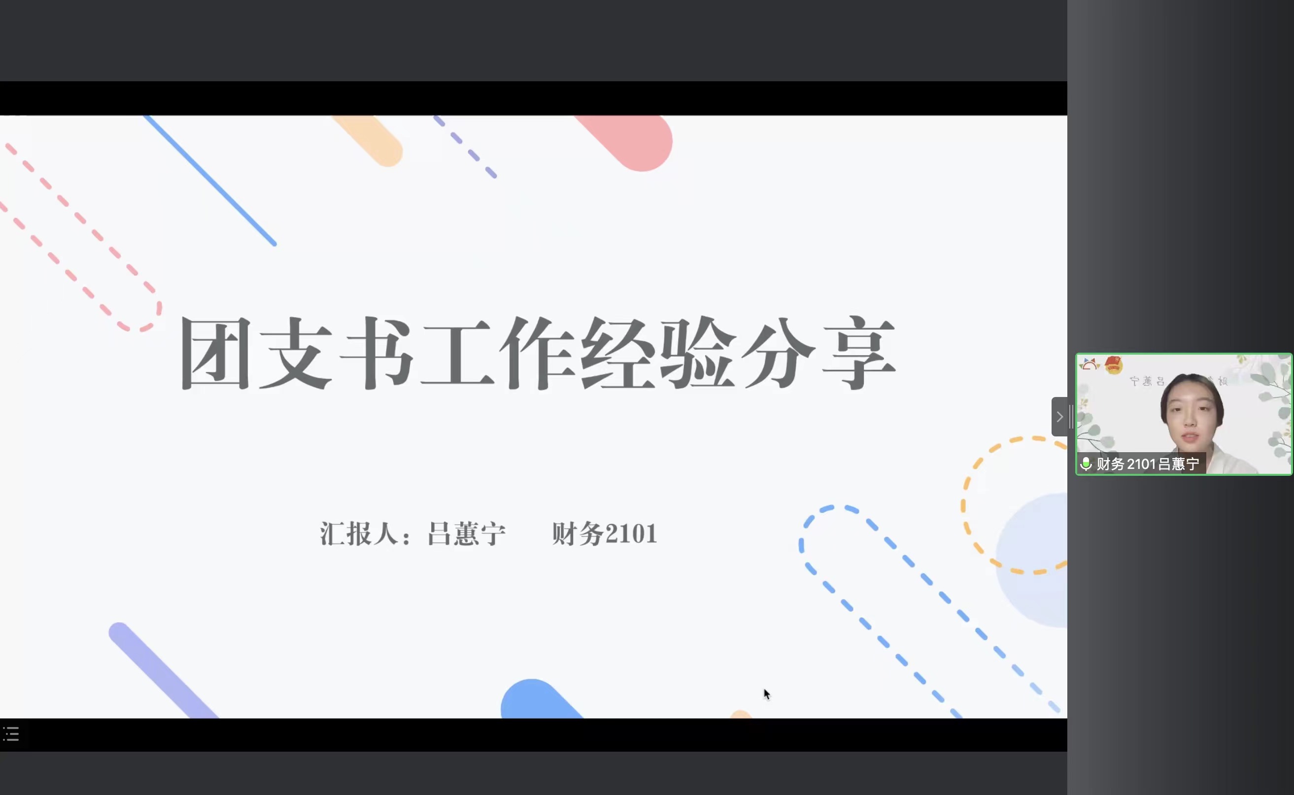 分享会还邀请了优秀团支书代表财务2101吕蕙宁进行经验分享,她结合自己过去一年的工作,重点围绕青年大学习、主题团日、大型活动组织、团员管理等展开,分享了自己在工作中的一些经验。同时,她提到了怎么干好团支书的工作,要学会利用办公小程序,学会分配任务,提高办事效率与质量,把握时间节点,也在工作中收获了责任的力量与集体的幸福感。