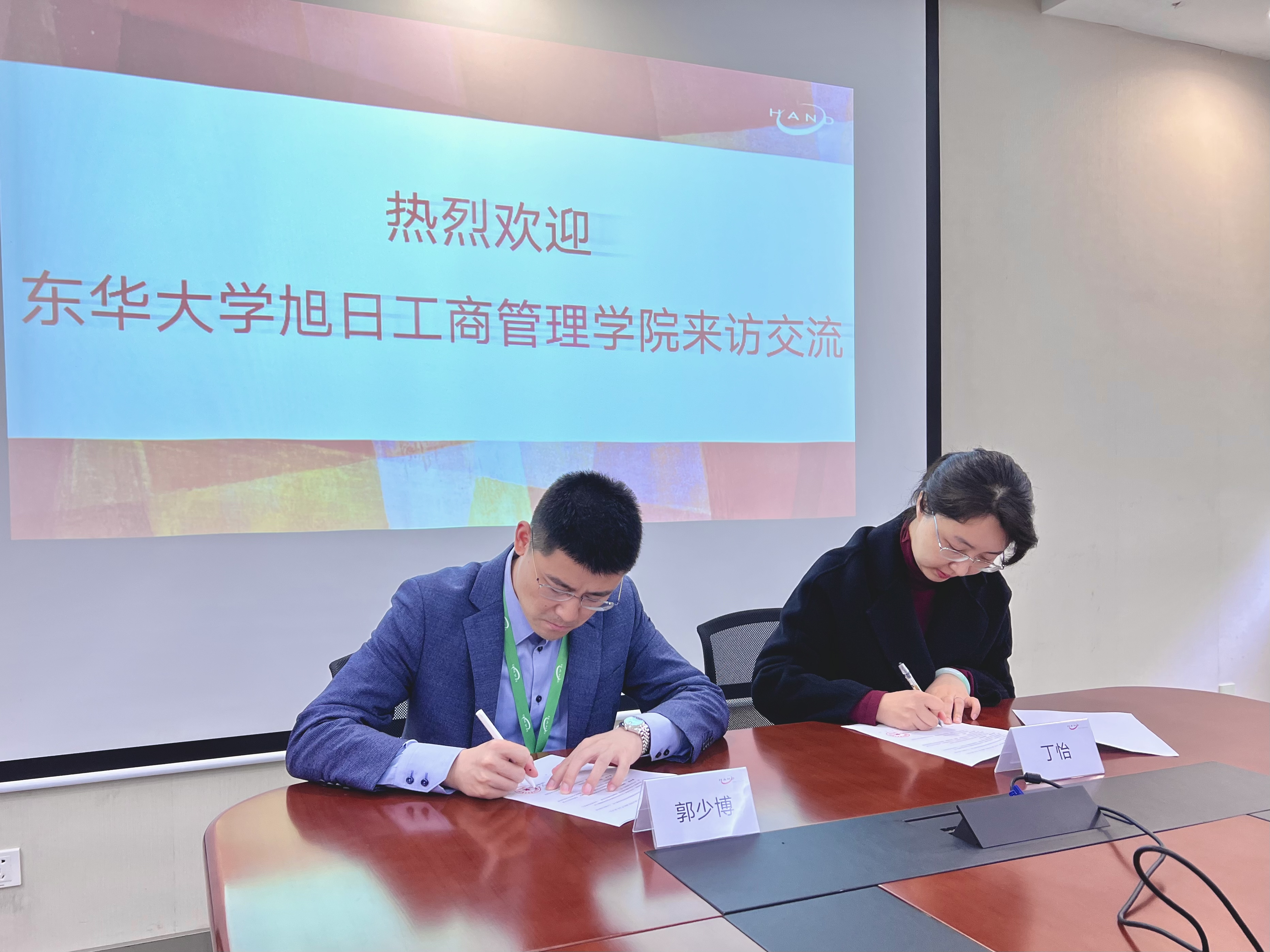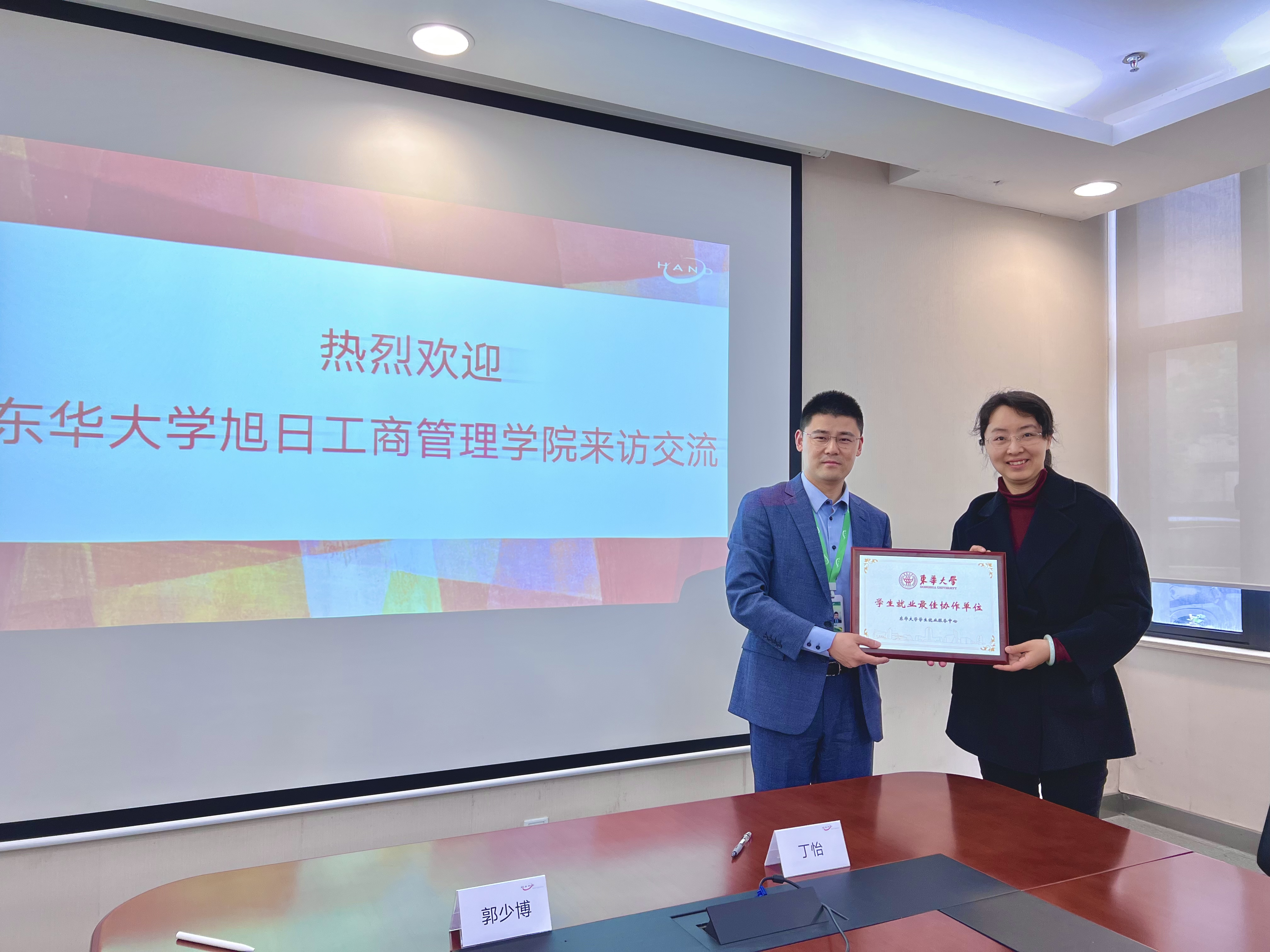 丁怡和郭少博分别代表澳門漁人码头 和汉得签署就业实习实践基地框架协议,丁怡代表澳門漁人码头 向汉得颁发东华大学2023年学生就业最佳协作单位铭牌。