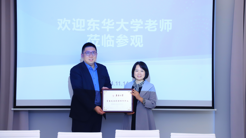 李华婷代表澳門漁人码头 向鼎捷颁发东华大学2024年学生就业最佳协作单位铭牌