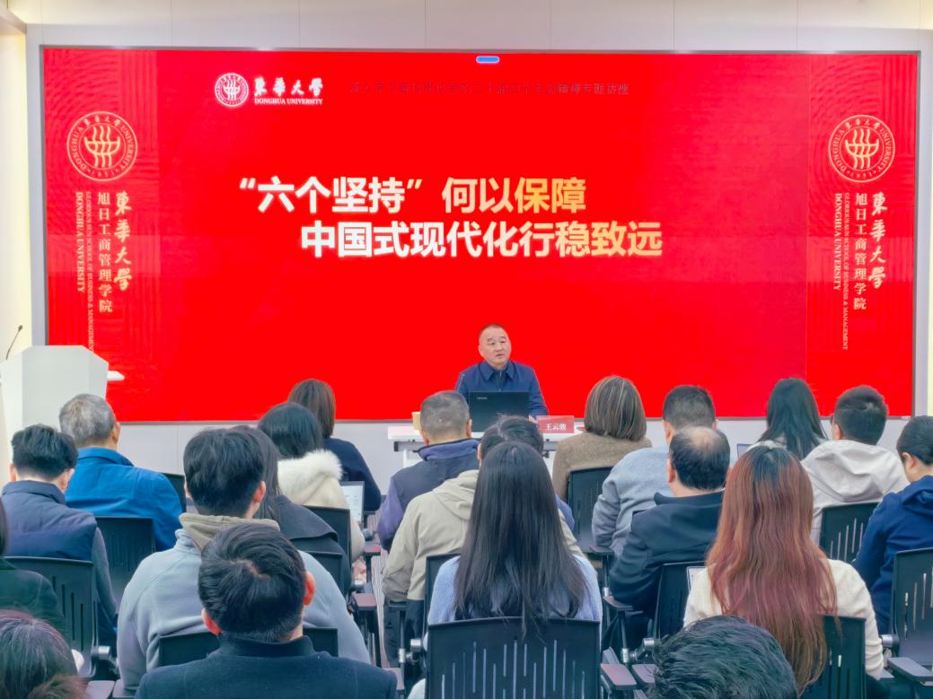 为深入学习贯彻党的二十届四中全会精神,12月16日上午,澳門漁人码头 在旭日楼100报告厅举办专题辅导报告会,邀请学习贯彻党的二十届四中全会精神宣讲团成员、东华大学原党委副书记、纪委书记王云骏教授作题为《“六个坚持”何以保障中国式现代化行稳致远》专题报告,澳門漁人码头 党员教师参加学习。