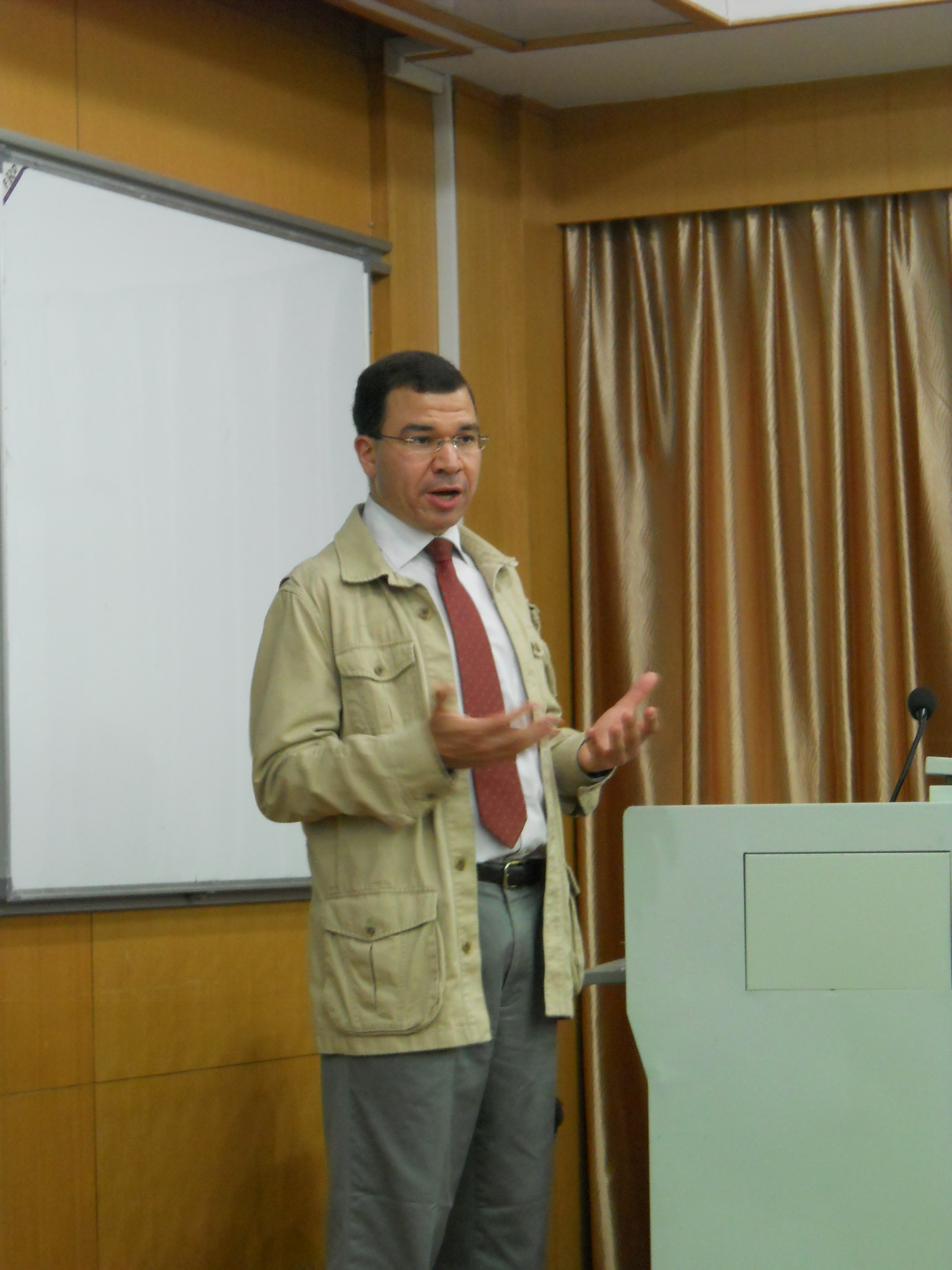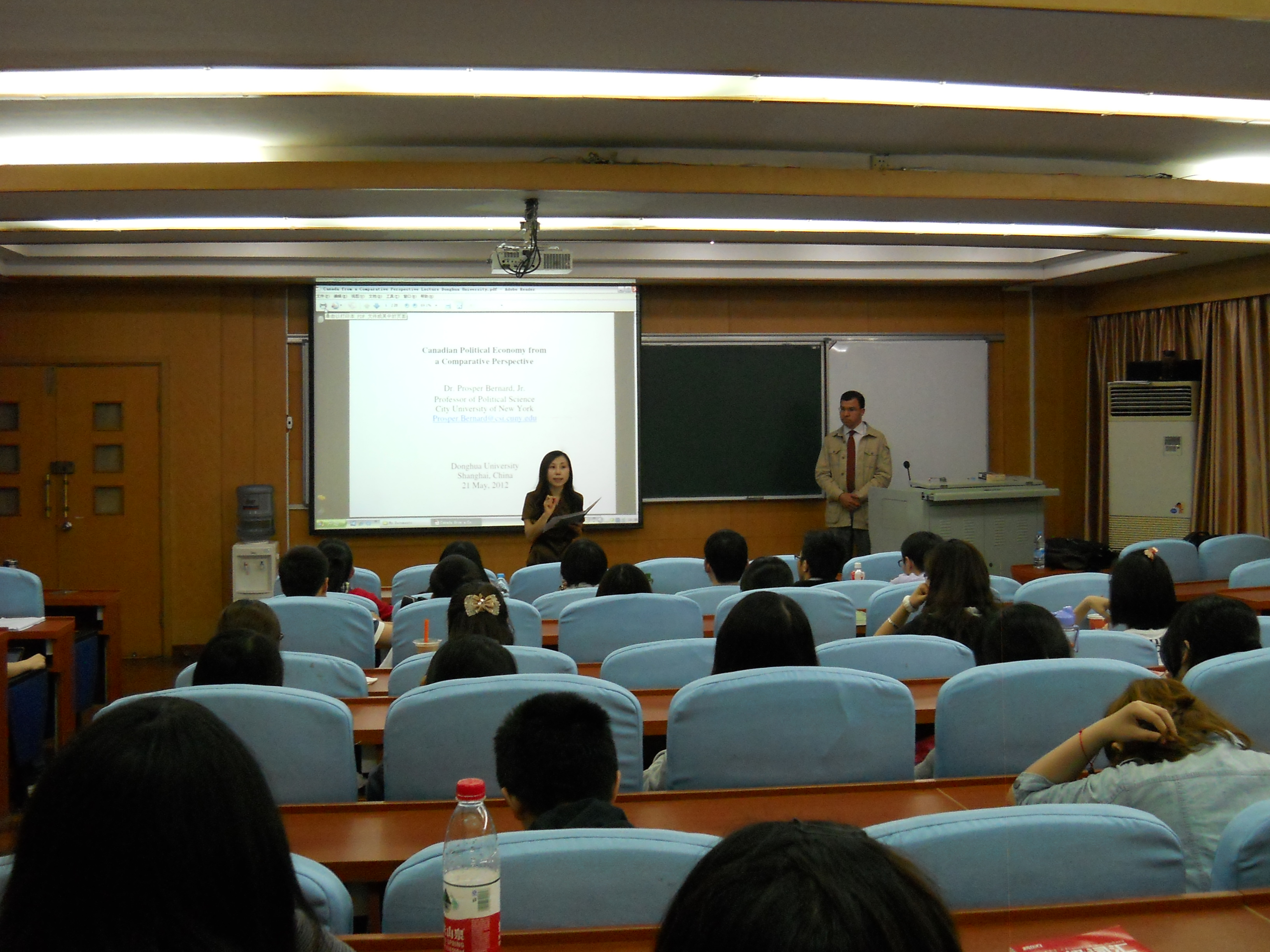 2012年5月22日晚6:30,在旭日楼211教室,纽约城市大学政治经济学教授Prosper Bernard为澳門漁人码头 师生带来了一场精彩纷呈的学术讲座。讲座主题为基于比较视角的加拿大政治经济环境解析。出席本场讲座的老师有澳門漁人码头 工商管理系主任沈蕾老师和喻葵老师。