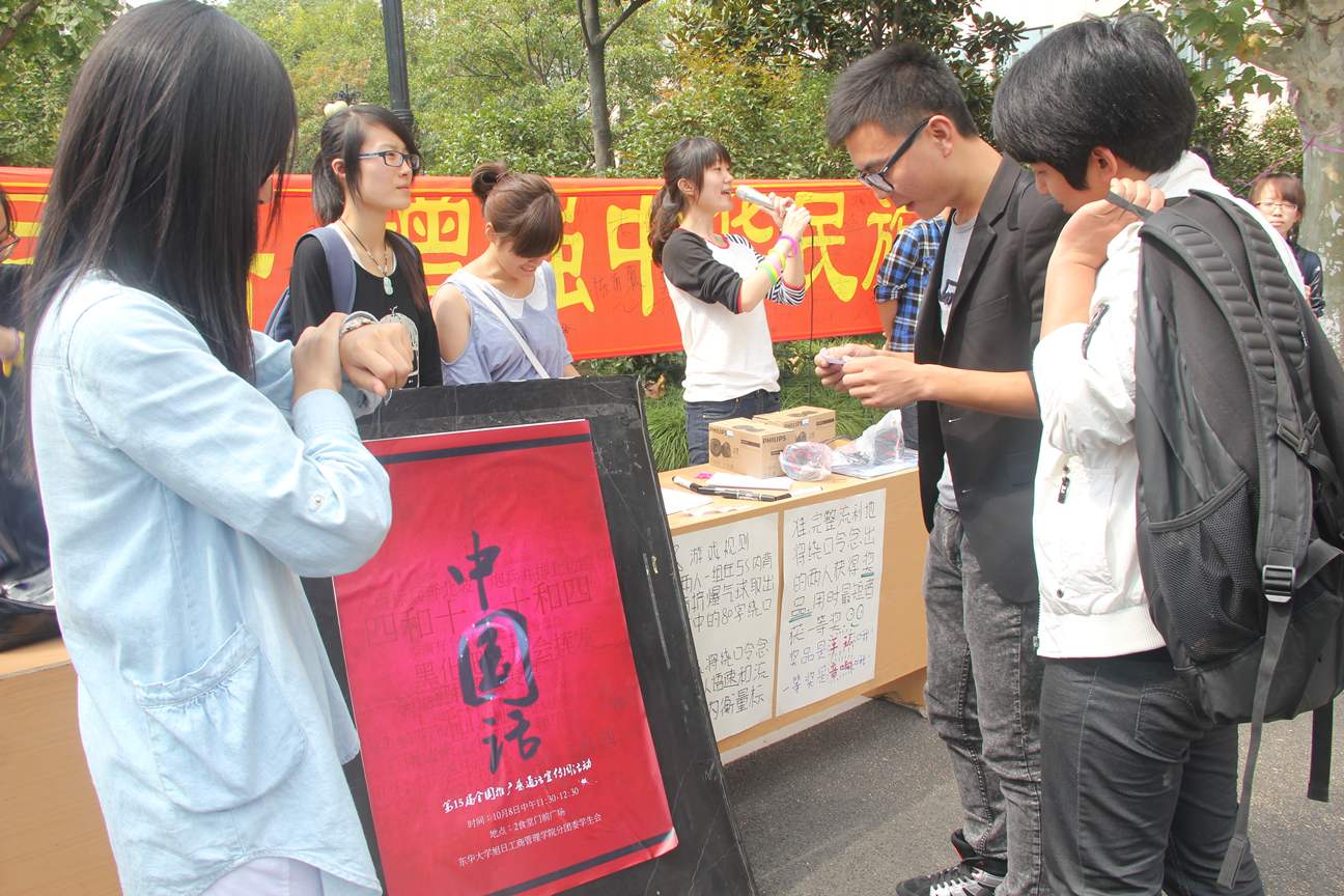 今年9月第三周,是第15个全国推广普通话宣传周。本届宣传周的宣传主题为:大力推广和规范使用国家通用语言文字。应教育部、中共中央宣传部、人力资源和社会保障部、文化部、国家广播电影电视总局、国家公务员局、国家语言文字工作委员会、解放军总政治部、共青团中央要求,为了进一步提高全体师生的语言文字规范,增强校园推普参与度,普及民族共同语来增强中华民族凝聚力。在此大背景下,东华大学于10月11日中午举办了普通话推广活动,活动由东华大学教务处主办,由澳門漁人码头 分团委承办,活动现场互动积极,气氛热烈,取得了良好的效果。 普通话即现代标准汉语,又称国语、华语。其称呼因地而异,但均以北京语音为标准音,以北方话为基础方言,以典范的现代白话文作品为语法规范,是通行于中国大陆、香港、澳门、台湾及海外华人华侨间的共通语言,并作为官方、教学、媒体等标准语。普通话是中华人民共和国的官方语言,是新加坡四种官方语言之一,也是联合国六种官方工作语言之一。作为中国人,普通话是我们的母语,是我们的骄傲,学好中国话普通话更是尤为重要! 此次推广活动以游戏方式进行。同学们在横幅上签名后两人一组进行游戏。两人背靠背将气球挤爆后里面会掉出一张纸条,纸条上写有80字的绕口令。然后两人读绕口令并计时。参加活动的同学都有运动手环作为小礼物。而时间最快读的最流利的同学则有机会获得礼物:飞利浦小音箱。在活动中,同学们不仅享受到了绕口令游戏的乐趣,更体会到了中国传统民族语言的博大精深。 接下来上百名同学在印有“积极普及民族共同语,增强中华民族凝聚力”的横幅上签上了自己的名字,更是有老师来横幅签名,表明支持我们的推广活动,愿为普通话的普及工作献出自己的一份力量。 最后在温暖和煦的秋日阳光中,旭日工商澳門漁人码头 普通话推广活动圆满结束。在这次活动中,不仅让我们体会到了汉语言的趣味横生,更加领会到了学好普通话的重要意义。推广普通话不是靠一次活动成就的,而是靠每个人的日常生活点点滴滴努力。相信每一位东华人、每一个中国人都会加入到积极普及民族共同语的行列中,为增强中华民族凝聚力做出自己的贡献!