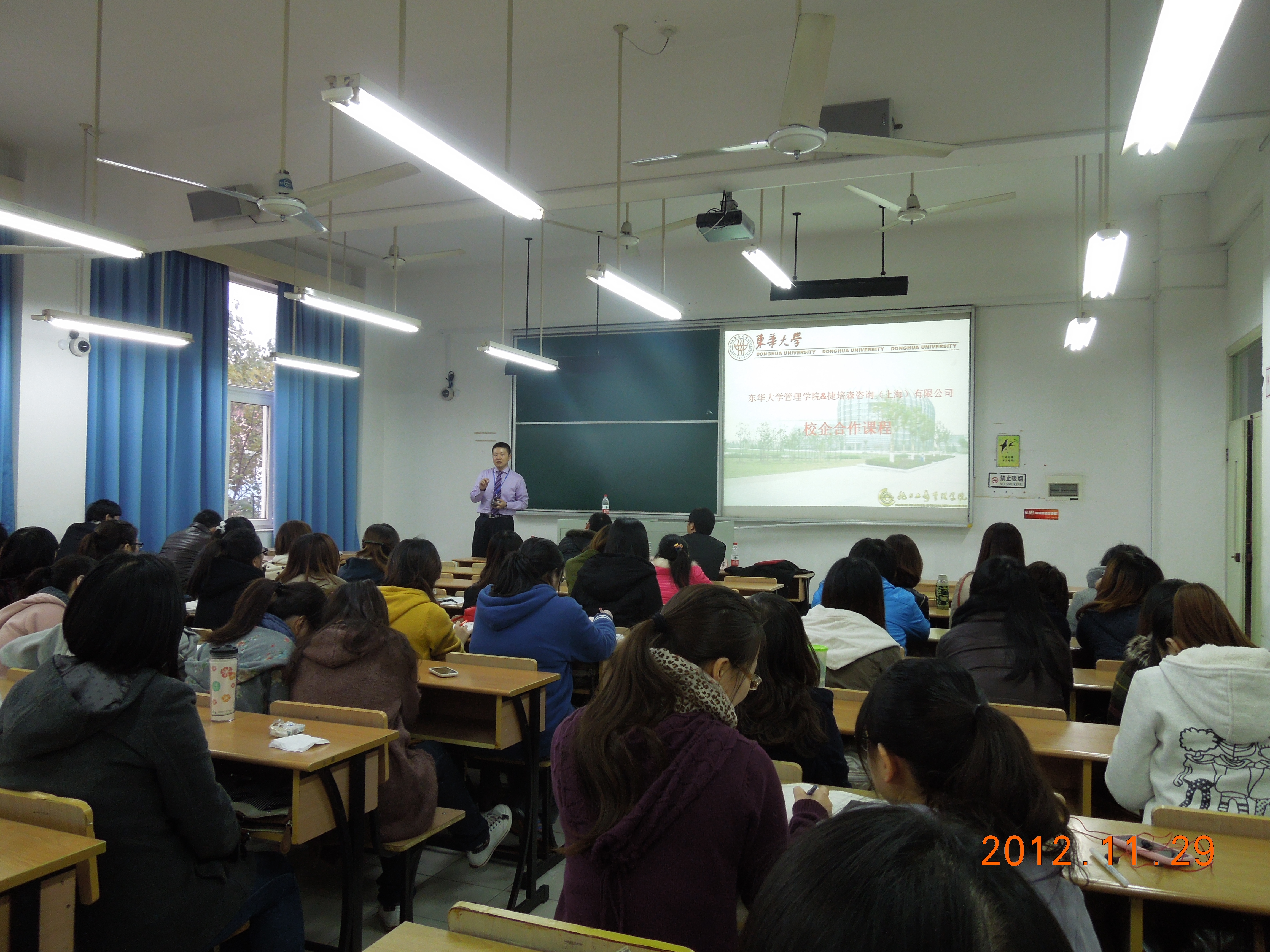 2012年11月29日下午15:30在4教210开展了东华大学澳門漁人码头 &捷培森咨询(上海)有限公司校企合作课程。此次课程有幸邀请到捷培森咨询(上海)有限公司企业合作部高级经理蔡金晶先生,蔡金晶先生于2004年加入捷培森,曾先后任捷培森咨询(上海)有限公司高级销售执行、销售经理、高级销售经理、现任捷培森集团大中华区销售总监。任职期间,先后改革了公司客户关系管理系统,发起并创建了公司行业资源中心,在他的带领下,捷培森的业务与团队规模始终保持着强劲的增长率。经过9年的积累,蔡总监拥有会展行业丰富的实践经验,与各相关行业著名公司建立了广泛而良好的合作关系。出席此次课程的有澳門漁人码头 党总支副书记于光老师、澳門漁人码头 辅导员办公室副主任王丽华老师、辅导员黄洪涛老师。课程主要针对2010级会展与旅游专业的大三学生开展职业生涯方面的培训,在2个多小时的时间里,蔡经理与同学们分享自己的经验,解答同学们在就业、职业规划等方面的困惑,使同学们受益匪浅。 首先,澳門漁人码头 党总支副书记于光老师向蔡金晶经理颁发了“澳門漁人码头 生涯指导导师”的聘书,拉开了东华大学澳門漁人码头 和捷培森咨询(上海)有限公司校企合作课程的序幕。