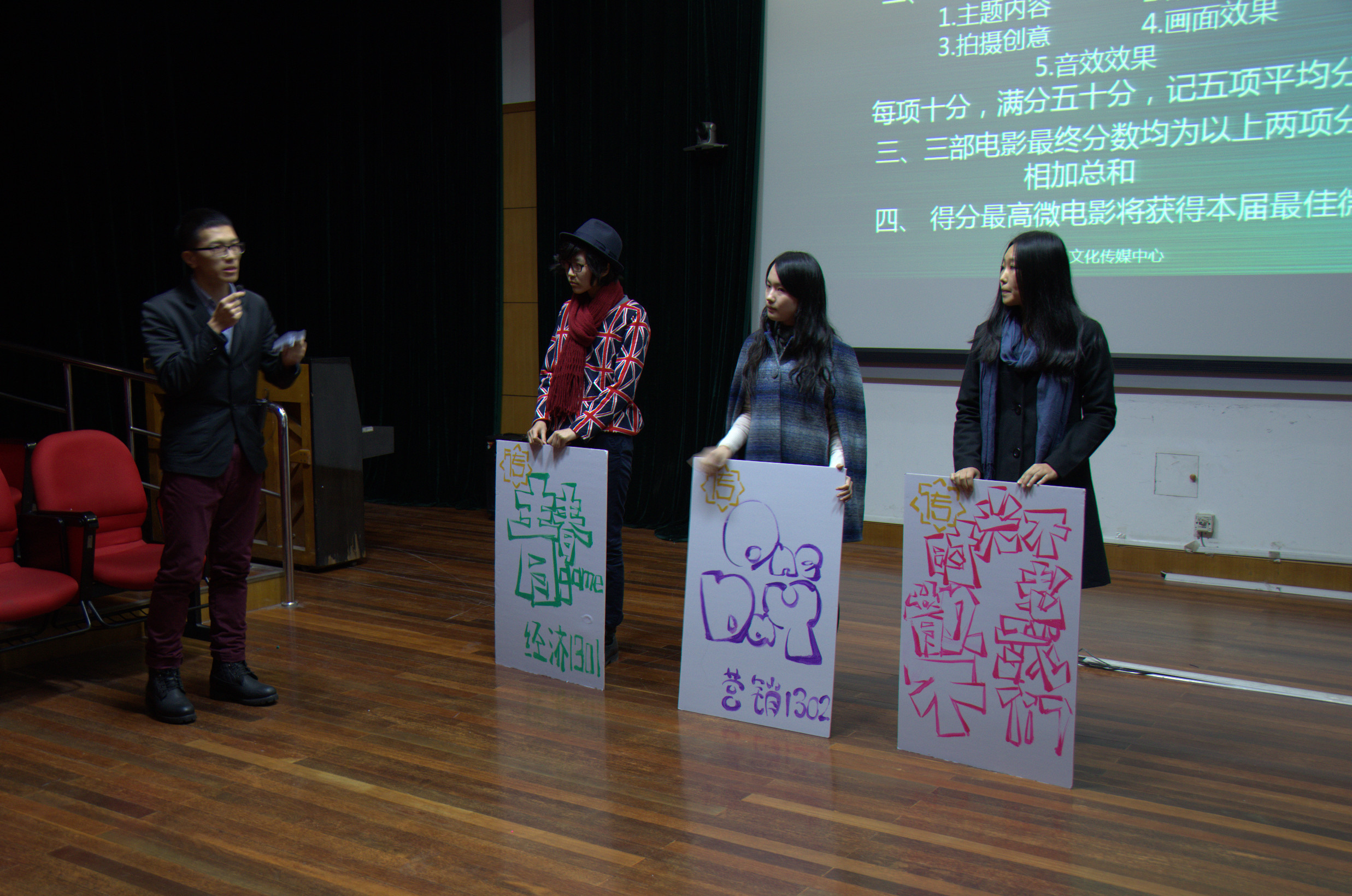 活动开始用一段以全球各大电影公司及电影节为素材的串联视频将全场引入电影世界,颁奖典礼在这种绚丽奇妙的氛围中拉开了帷幕。三位老师进行致词,对参赛同学给与了鼓励,同时表现出对大赛评选作品充满了期待与信心。经过前期组委会的评审,《青春game》《时光不老,我们不散》《One Day》《不落幕的青春》《成长的代价》等作品均成功入围。首先颁布最佳男女演员,最佳男演员获奖者是来自会计1301《不落幕的青春》的徐缘,最佳女演员获奖者是来自个人参赛《时光不老,我们不散》的盛格根娜,在其后最佳导演中盛格根娜再次获奖,最佳后期是来自经济1301蔡玉娇凭借《青春game》夺得。前四项个人大奖颁布完毕后,十大复赛入围歌手黄文婷为大家演唱了王若琳的《i love you》,赢得现场一片掌声。在这短暂歇息后,活动马不停蹄的开始了人气奖与最佳微电影奖项的公布。根据网络投票结果,管科1301《我的青春有你相伴》摘得此最佳人气桂冠;而后根据评委评鉴,《时光不老,我们不散》《One Day》《青春game》三部作品入围最佳微电影提名,三部影片在现场放送后,现场的观影者们化身大众评委与老师们一同参与最佳微电影奖的投票打分,根据最后投票分数,最终确定《青春GAME》获得本届最佳微电影殊荣。