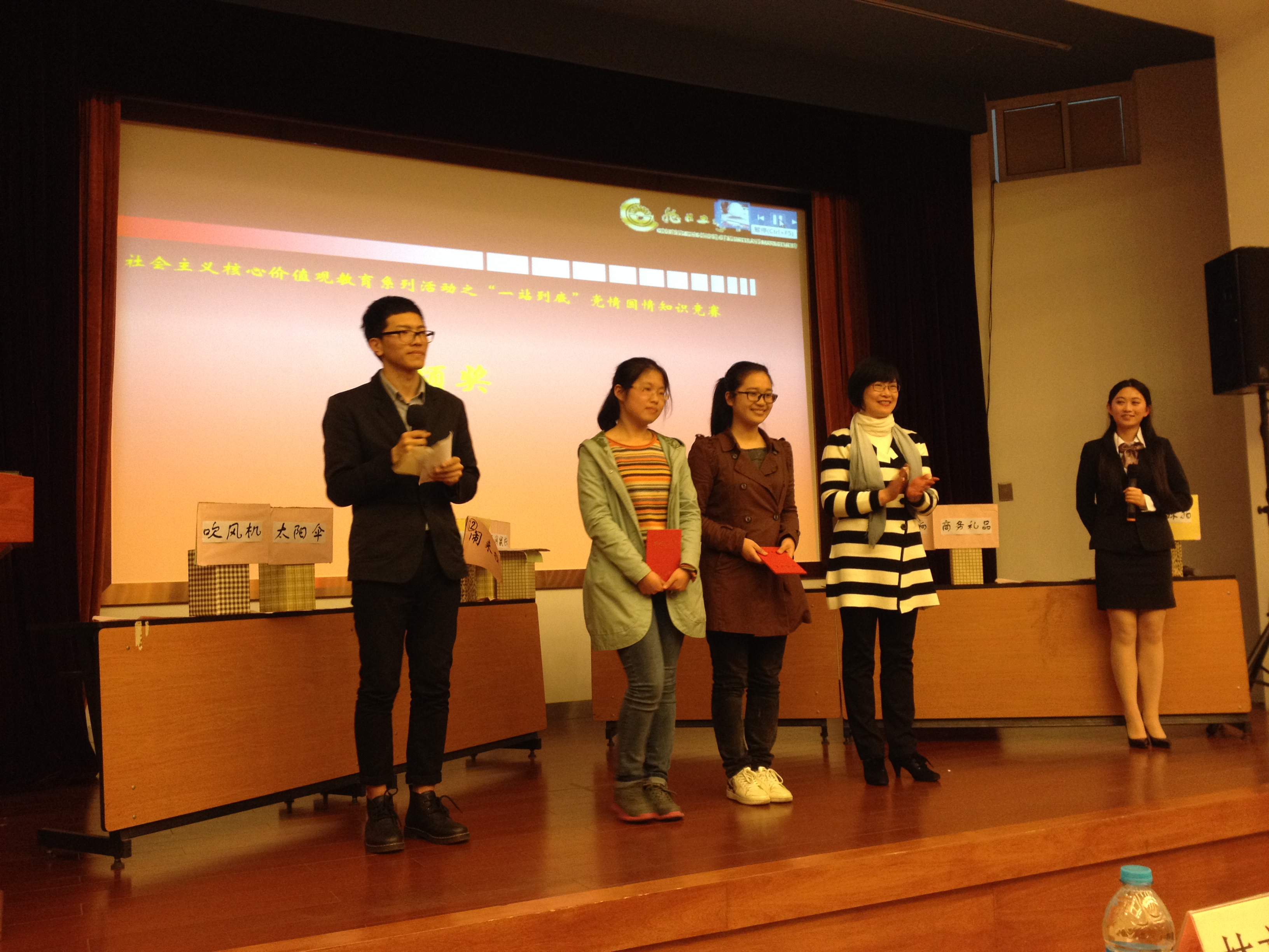 4月22日下午,由澳門漁人码头 举办的“一站到底”——党情国情知识竞赛在东华大学延安路校区旭日楼400演讲厅举行。澳門漁人码头 党总支书记林文伟老师、学生处副处长宋德军老师、校党委组织部副部长杜明老师、澳門漁人码头 党总支副书记叶晓燕老师以及澳門漁人码头 的辅导员老师们参加了此次活动。此次知识竞赛是澳門漁人码头 社会主义核心价值观教育系列活动的一项内容,目的是通过知识竞赛的形式普及时事政治常识,激发党员和积极分子关注党情国情的兴趣。