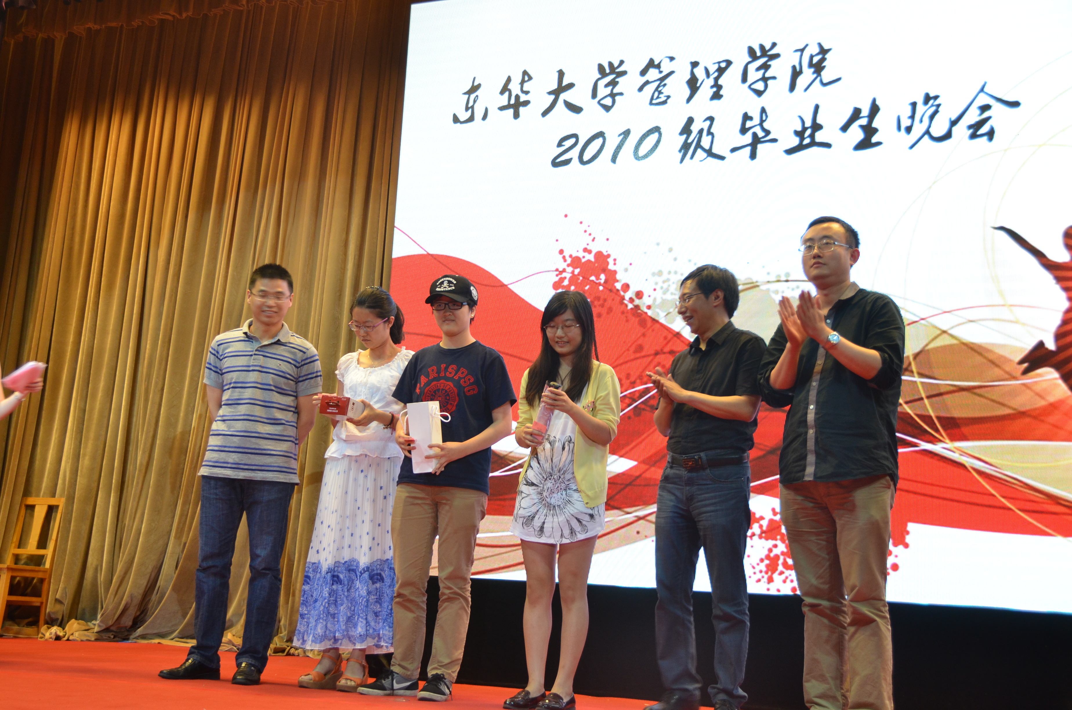 2014年6月24日下午六点半,东华大学澳門漁人码头 2010级毕业晚会在第三教二层礼堂隆重举行,本次晚会以“拾·光”为主题,作为毕业季系列活动之一,由学生党员和骨干组织策划,历经两个月多月的精心筹备,在老师同学们的期待中于毕业典礼前夜拉开帷幕。自2008年以来,澳門漁人码头 每年学生毕业前期都会举办以学生为主体的毕业晚会,作为毕业季系列活动之一的毕业晚会,内容精彩丰呈,含义深刻,饱含深情,受到了师生的大力支持和喜爱。今年恰逢澳門漁人码头 院庆20周年,此次的毕业晚会显得格外意义深重。东华大学学生处副处长宋德军、东华大学团委书记张晓东、澳門漁人码头 党总支书记林文伟、澳門漁人码头 院长赵晓康、澳門漁人码头 副院长姚洪心应邀出席晚会,澳門漁人码头 各专业老师、校友、学生工作办公室全体辅导员和2010级同学参加了此次晚会。
