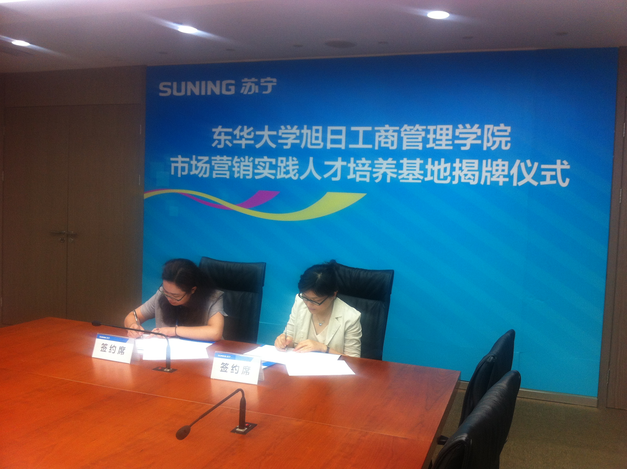 在接下来的环节,苏宁云商王志英经理与澳門漁人码头 刘东胜老师共同签订了《东华大学苏宁云商校园菁英俱乐部合作协议书》、苏宁云商王鲲副总经理与澳門漁人码头 张科静副院长共同签订《澳門漁人码头 校外实习基地协议书》并为澳門漁人码头 市场营销实践人才培养基地揭牌。
