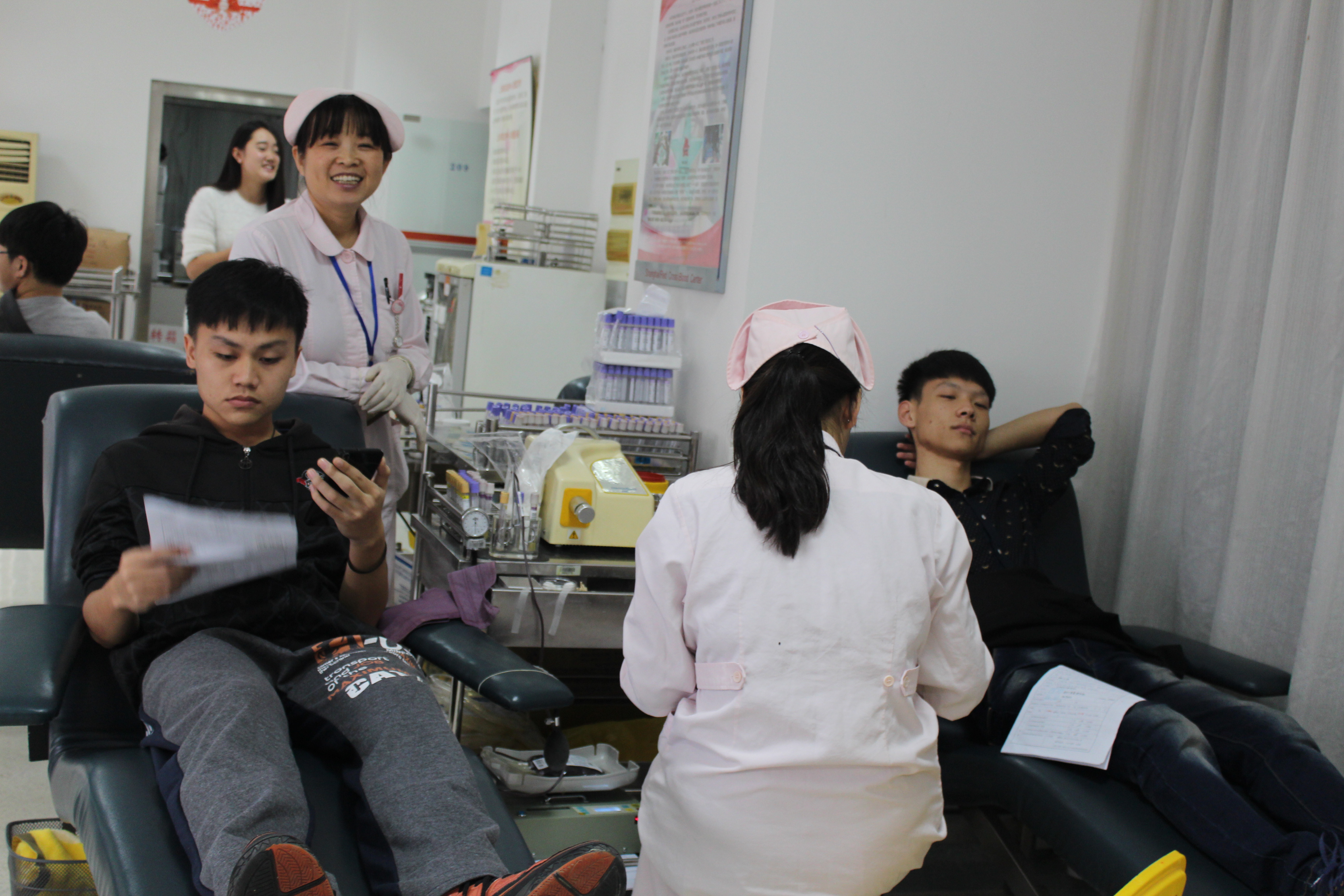 在献血室里,澳門漁人码头 总支书记林文伟老师和副书记叶晓燕老师亲自来到这里慰问献血的同学们,并与同学们亲切地面对面地交谈。林老师特意叮嘱同学们:“献过血后要注意保暖,减少运动量,不要淋雨,充分休息。”