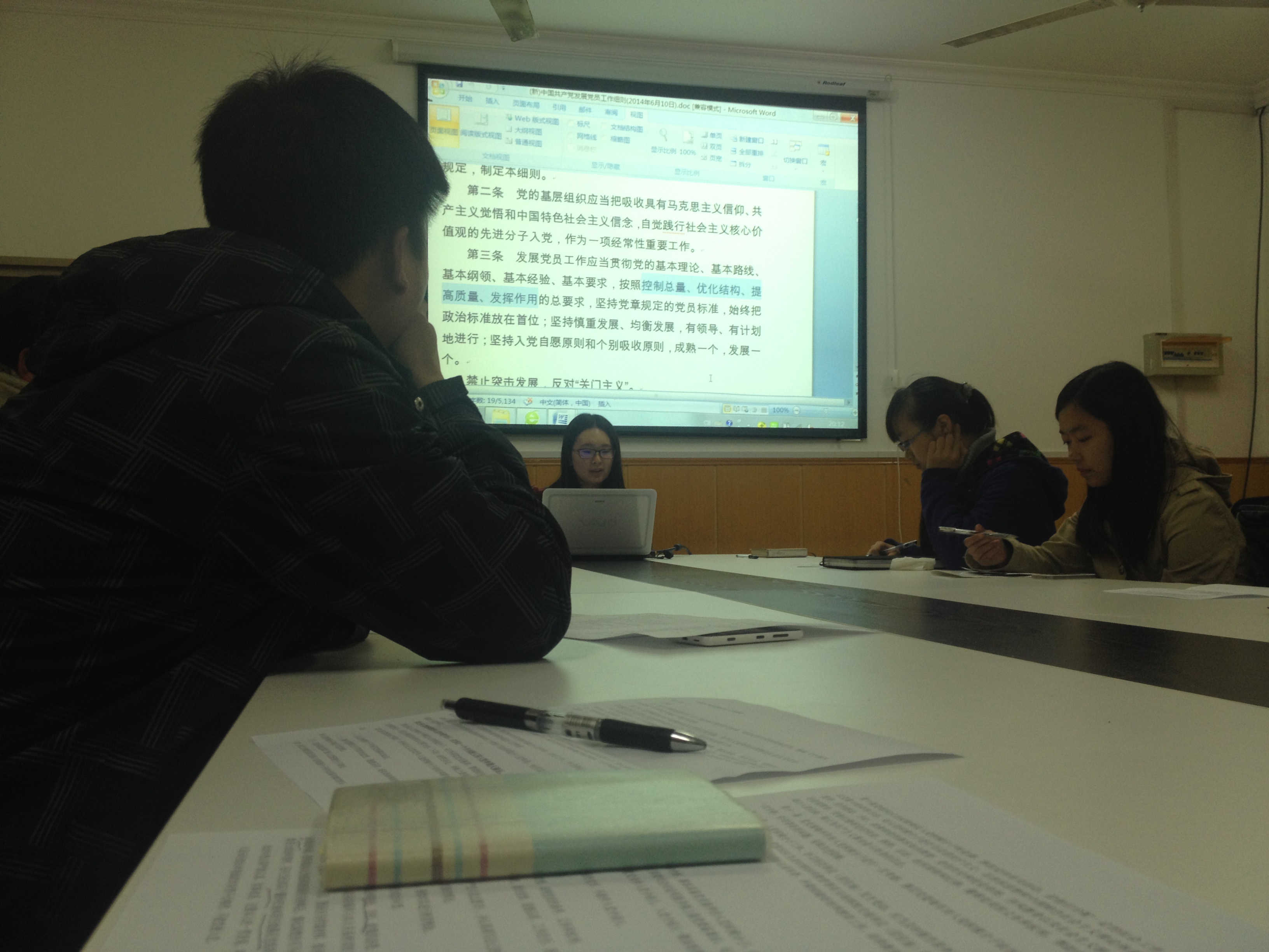 姜泱同学对入党积极分子的档案材料进行了解析,指出了联系人在对积极分子进行观察培养的同时,需将书面材料做好认真的审查和归档,做到所有积极分子的材料都可追溯,具有连续性,且清晰记档。 徐迎迎同学就入党介绍人的主要工作进行了重点分析,将介绍人工作分为三大部分,对积极分子的信息输出——向发展对象解释党的纲领、章程,说明党员条件、义务和权力;对积极分子的信息输入——认真了解其入党动机、政治觉悟、道德品质、工作经历、现实表现等;最后向支部大会负责任地介绍发展对象的情况。 沈嘉斌同学负责为大家解读第18至21条,并对在召开讨论接收预备党员的支部大会,有表决权的到会人数、资格和出席、请假情况做出了明确说明。 祁夺同学对第22至25条的阐述为大家重新梳理了组织上吸收预备党员的单位资质,和发展大会的要求及流程。 何力同学承上对预备党员的接收、教育、考察和转正工作进一步进行补充。 金雨晴同学为大家分享细则第31~35条,向大家重点分析了预备党员预备期的相关问题,并提醒如果预备党员需要继续考察和教育的,可以延长一次预备期,延长时间不能少于半年,最长不超过一年。并强调转正申请应由预备党员本人主动提出,而党员的党龄,从预备期满转正为正式党员之日算起。 陈宇同学就预备党员人事档案一事为大家重点解读,并对发展党员时当注重优化工、农、知识分子队伍结构加以强调。 最后,支部书记纪静老师就40至44条发展党员工作的领导纪律与大家一同分享心得体会,并将新细则中作出修改和添加的部分与原试行细则进行详细对比。 在本次组织生活中,各位党员同志不仅细致认真地对新细则的每一条的内容进行详细了解,更是对十八大后中央高度重视党员队伍建设的大背景有了更深入和细化的认识。秉着严格标准、严格培养、严格程序、严格责任的理念,在未来的发展党员工作中,将政治标准放在首位,牢记党要管党,从严治党,真正做到控制总量、优化结构、提高质量、发挥作用,让我党接纳更多真正先进优秀人才! 旅游管理学生党支部徐迎迎 |