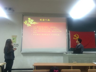 2014年12月15日晚上七点,经济第一学生党支部于四教104开展2015年第四季度支部预备党员发展大会,本支部党员22名,其中有表决权正式党员14名,出席今天大会的党员共有16名,其中有表决权的正式党员10名。与往常不同的是,此次会议还有15名往期积极分子前来旁听学习。 会议由支部组织委员翁雨乔同志做开场白,支部副书记陆赛楠同志主持。首先,会议进行第一项,全体起立奏唱《国歌》。