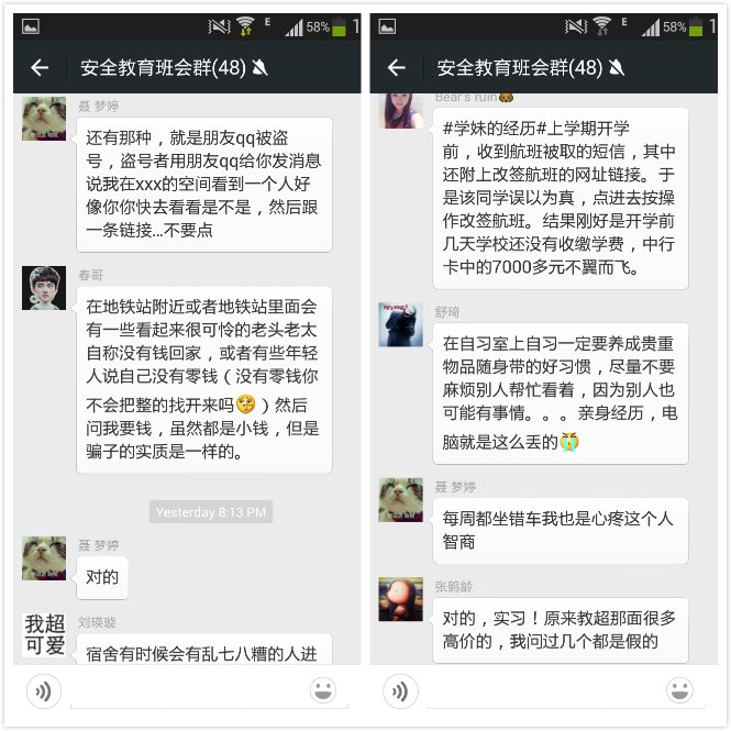 2015年5月17日晚,为切实加强同学们的自我安全保护意识,金融1201和金融1202班紧紧围绕“校园安全教育”这一主题,在寝室间交流分享身边安全隐患及案例的基础上,我们在班群里同样展开了热烈讨论。同学们踊跃发言,讲述了自己的亲身经历和听说过的相关事件,引起了大家的共鸣。同学们提出的案例主要涉及了寝室防盗、夜归防狼、网络诈骗、短信和电话诈骗、地铁站和商场诈骗、实习诈骗等,并提出了相应的应对措施。 1.寝室安全问题 大学生宿舍盗窃案件时有发生。除了宿舍管理制度有待加强之外,大学生的防盗观念和安全意识也亟待加强。在班会中,有同学提到“习惯不关门”,正是这种薄弱的戒备意识导致我们许多的钱财损失,也为盗窃分子大开方便之门。在寝室内,应妥善保管自己的钱财和贵重物品,对周围的人树立起必要的戒备心理。出门时,一定要记得关好寝室门,不能想着只是离开一会儿,就放松警惕。同理,有同学以自己的亲身经历提醒大家暂时有事离开教室时,也要养成随身携带贵重物品的好习惯。