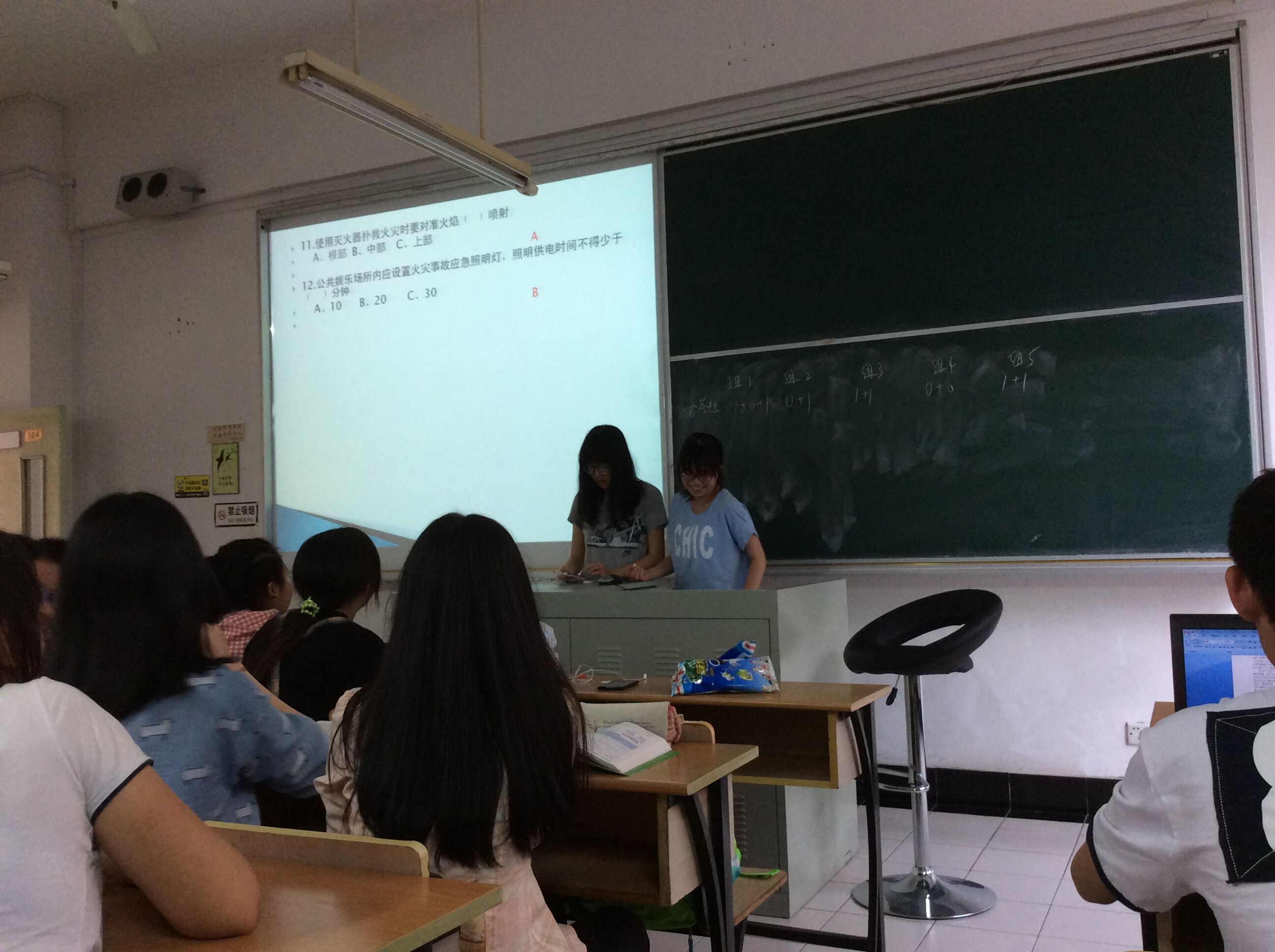 为了鼓动每一位同学的热情参与,两位负责班委将竞赛分为两个部分。第一部分为必答题,每轮Q&A在15秒内完成,过程紧张刺激,各组同学渐入佳境,稳扎稳打,步步为营,一时难分高下。第二部分为抢答题,每组的代表选手为了按铃抢破了头,通过激烈的角逐争夺抢答题的答题权,一次又一次把赛场气氛推向高潮。