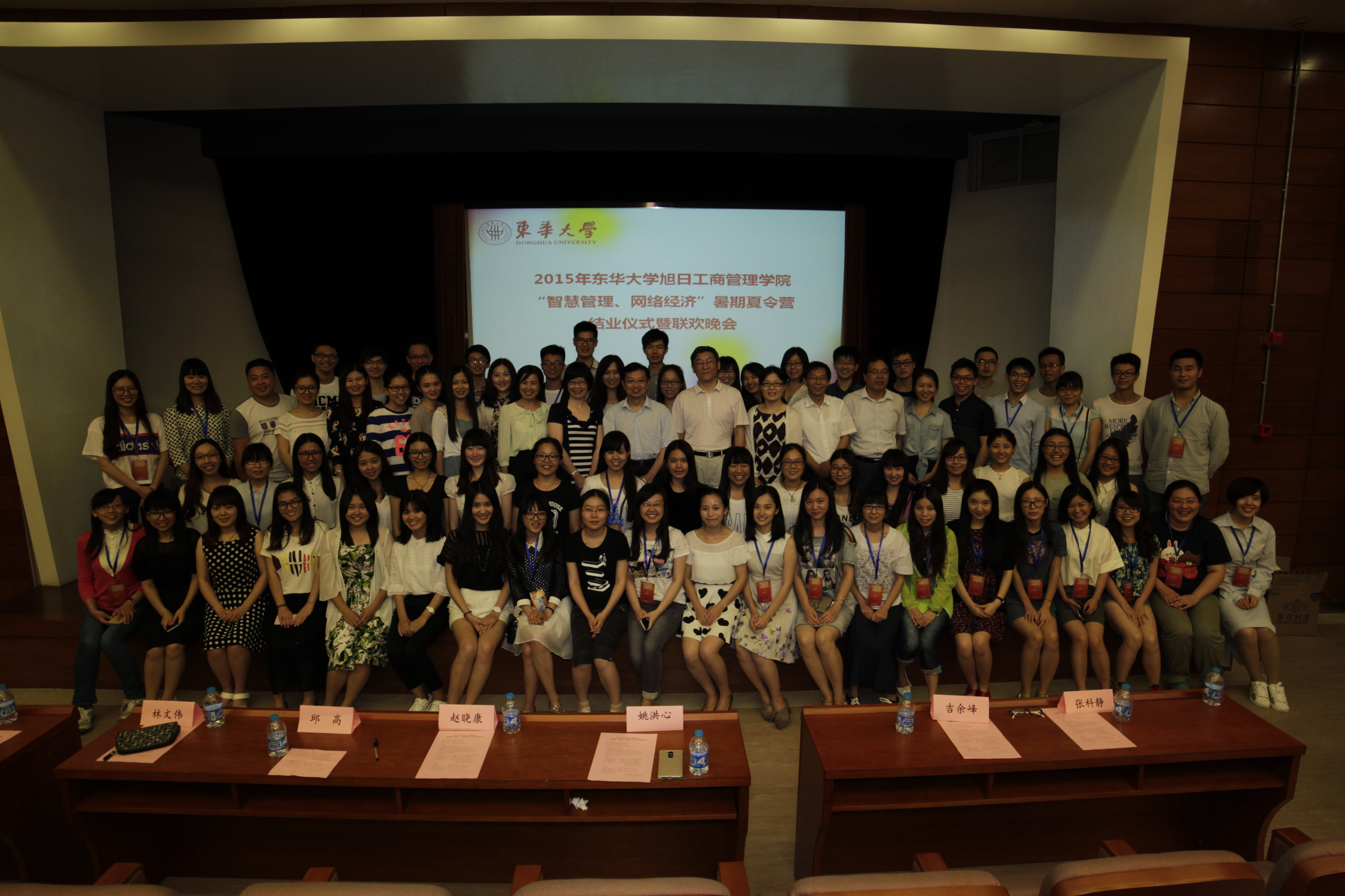 7月10日晚6点30分,2015年澳門漁人码头 “智慧管理、网络经济”暑期夏令营结业仪式暨联欢晚会在旭日楼400报告厅拉开了序幕。本次暑期夏令营由东华大学研究生部主办,旭日工商澳門漁人码头 协办,得到了多位经管领域专家、兄弟院校教授的大力支持。夏令营共吸引来自全国各地19所高校共71名本科生的参与,在经历了为期3天的学术盛宴和交流合作后,大家满载收获齐聚一堂献歌献艺为此次夏令营画上了一个圆满的句号。 本次晚会邀请到东华大学副校长邱高教授、澳門漁人码头 党总支书记林文伟老师、澳門漁人码头 主持工作副院长赵晓康教授、澳門漁人码头 副院长张科静教授、副院长姚洪心教授、澳門漁人码头 党总支副书记叶晓燕老师、金融系系主任吉余峰副教授以及辛勤工作的辅导员蓝维春老师和志愿者们。 东华大学副校长邱高教授为夏令营致辞,对澳門漁人码头 暑期夏令营活动给予了充分的肯定,鼓励同学们保持这种学习热情和积极的学习态度,期待同学们明年能够到东华大学延续硕士阶段的学习。在欣赏了一段温馨的夏令营回顾视频后,澳門漁人码头 副院长姚洪心教授对本次活动进行了总结。姚教授强调东华大学澳門漁人码头 办学悠久、师资雄厚、教学专业化,在读研期间拥有众多国内外交流机会和丰厚的奖学金,而本次参与夏令营的学员在未来研究生推免时同等条件下也将获得优先推免权,最后他还向大家发出了欢迎来东华的诚挚邀请。随后,林文伟书记、赵晓康教授、张科静教授和叶晓燕副书记分别对结业学员、优秀学员、优秀志愿者颁发了结业证书和荣誉证书。