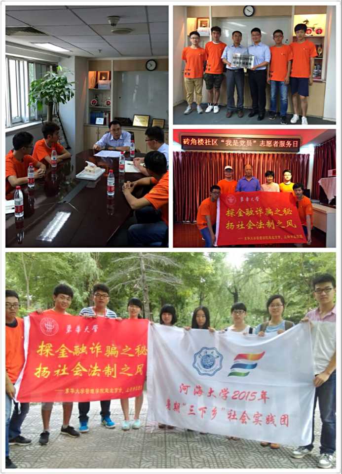 2015年7月12日至7月18日,东华大学澳門漁人码头 “探金融诈骗之秘,扬社会法制之风”暑期社会实践团分赴北京、上海两地同时开展实践活动。本次活动以法制宣传、诚信教育为主题,旨在帮助社区居民提高法律意识、普及金融知识,通过有针对性地组织一系列科普宣传、维权保护、诚信教育等,进一步探索防范金融诈骗之秘。 北京方面,团队首先在北京华堂律师事务所与律师开展交流活动。期间,事务所钱律师详细地为队员们讲解金融诈骗的内容、类型、途径等,并且耐心解答了队员们关于金融诈骗的一系列问题。会后,带队老师王健华代表澳門漁人码头 与华堂律师事务所共同建立社会实践基地,为今后的社会实践打下坚实的基础。 在了解相关的专业性法律知识之后,北京团队进驻砖角楼社区开始一系列的宣传教育活动。队员们在砖角楼社区设置摊位,摆好横幅,向过路的社区居民一一介绍金融诈骗的相关知识,并宣传防金融诈骗的一些简单技巧,居民们纷纷表示受益匪浅。除此之外,北京实践团队还与河海大学暑期“三下乡”社会实践团队进行了联谊活动,两所大学的实践团队共同展开法制宣传,发扬社会正气。