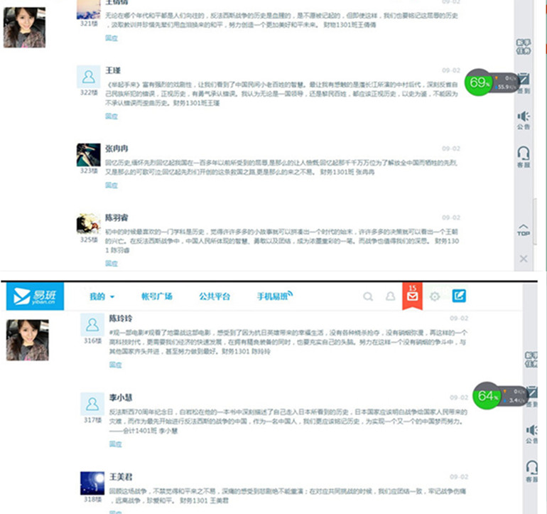 这次活动,除大二转入财务1301班级的四名同学无法加入澳門漁人码头 易班公共平台外,近三分之二的同学都有参与,达到了此次活动的目的。9月3号,在北京即将进行第一次纪念中国人民抗日战争战争暨反法西斯战争胜利阅兵,彰显了我们对历史的尊重,也昭告了我们对于和平的捍卫,期待明天阅兵所带来的震撼。 财务1301班 2015年9月2日