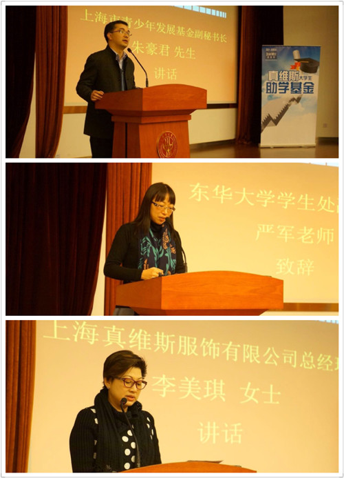 首先,东华大学严军老师详细介绍了本批学生的受助情况,期待与真维斯公司的更多合作。之后,受助学生代表——上海工程技术大学史亚平同学和东华大学王京同学上台发言,分别真实讲述了生活状况和受助经历,真挚感谢了真维斯公司不仅在物质上的帮助,更是在精神上的鼓励,真诚表达了努力奋斗和传递爱心的决心。随后,真维斯公司李美琪女士代表资助方上台表达了对广大受助学生的殷切期待和美好祝愿,并与上海市青少年发展基金会朱豪君先生一同向受助学生代表颁发助学金。最后,朱豪君先生上台总结:他对真维斯公司十年如一日的善举给予高度评价,对两校领导、老师的默默耕耘表示感谢,同时教导受助学生学会自强、学会感恩。颁发仪式结束后,真维斯店铺负责人专门对今年新获真维斯的受助学生进行店铺上岗培训。
