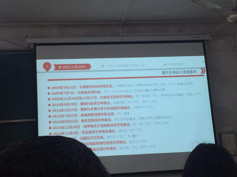 首先,吴老师对《中华人民共和国刑法修正案(九)》较刑法修正案(八)所作出的修改进行简单介绍,对其中更强力打击暴恐做了较为详细的说明。借此引出当前国内外发生的重大恐怖主义袭击事件。在了解了近来我们身边发生的恐怖袭击事件之后,同学对何为恐怖袭击也有了一定的了解。 紧接着,吴老师讲述了反恐的必要性,进而引出我国首部反恐怖主义法律——《中华人民公共国反恐怖主义法》。通过她的介绍我们对这部法律的大致结构和内容有了初步的认识,通过班会结束后的资料查询对具体的细则也有了深入的学习。在介绍中,吴老师对本部法律的四大重要意义做了说明,包括该法明确国家反对一切形式的恐怖主义;国家将反恐怖主义纳入国家安全战略;同时强调反恐怖主义工作应当依法进行,尊重和保障人权不得歧视;另外国家成立专门的反恐怖主义工作领导机构。为了能够贴近同学们的日常生活,吴老师将本部法律中的几条细则展示给大家,分别是第六十三条、七十六条和七十七条,强调了不得随意在网上传播不实恐怖主义信息,同时在作为恐怖主义袭击证人时应当懂得自我保护,最后鼓励大家进行科技创新对反恐事业做出力所能及的贡献。