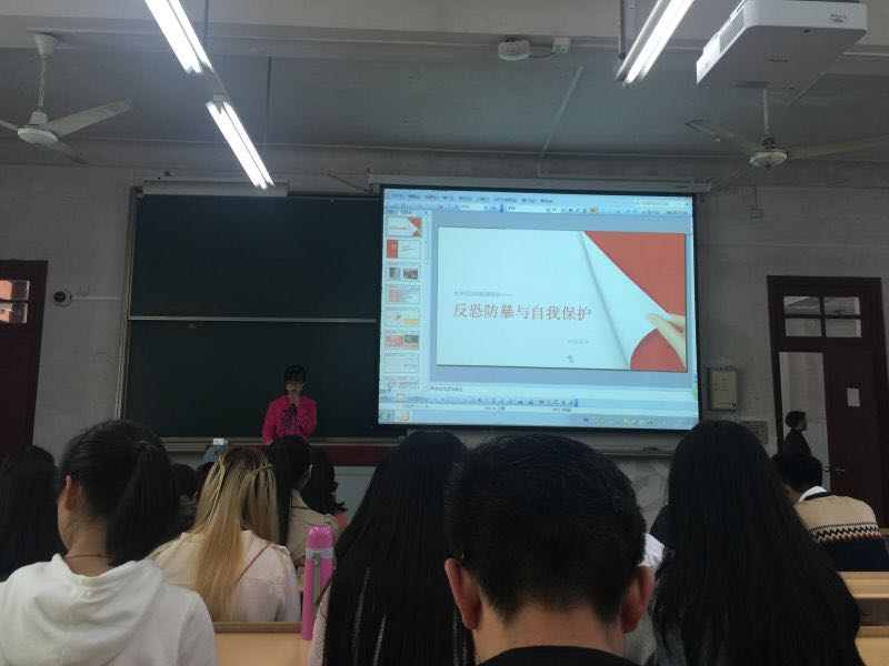介绍完法律知识后,吴老师给大家分享了一些常见的遇到恐怖袭击时的自我保护方法。包括遇到炸弹袭击、枪战、纵火、被劫持和生武袭击等情形的自我保护的方法和方式。同学们也都认真学习和掌握。最后,吴老师还给大家敲了一个警钟:即使那些恐怖事件看起来似乎离我们那么遥远,但是我们的时刻保护自己的警觉意识不能淡化,因为谁都无法去预知未来的事情,如果我们对将来可能发生的一切都没有准备的话,那么当它真正到来的时候,我们只能被现实牵着鼻子走。同时也提到了,如今大学生的自我保护警觉意识并不是那么强烈,那么就说明了这次班会的重要性及必要性, 如今,我们可以看到就在身边的恐怖事件是层出不穷,或许大家会认为可能离我们是很远的,但是防患于未然这句老话总是没有错的,所以希望每位同学在这次班会后可以培养这样一种意识,那么这就是最成功的了。