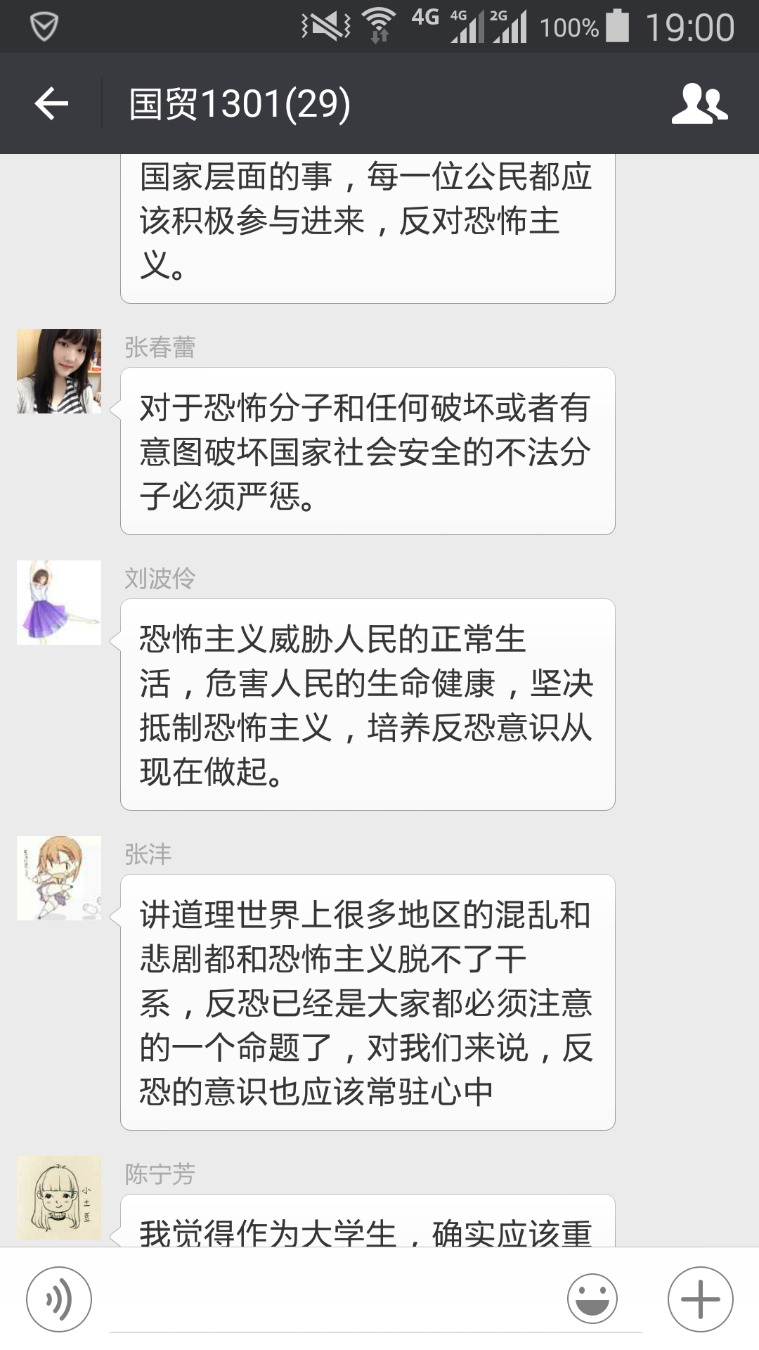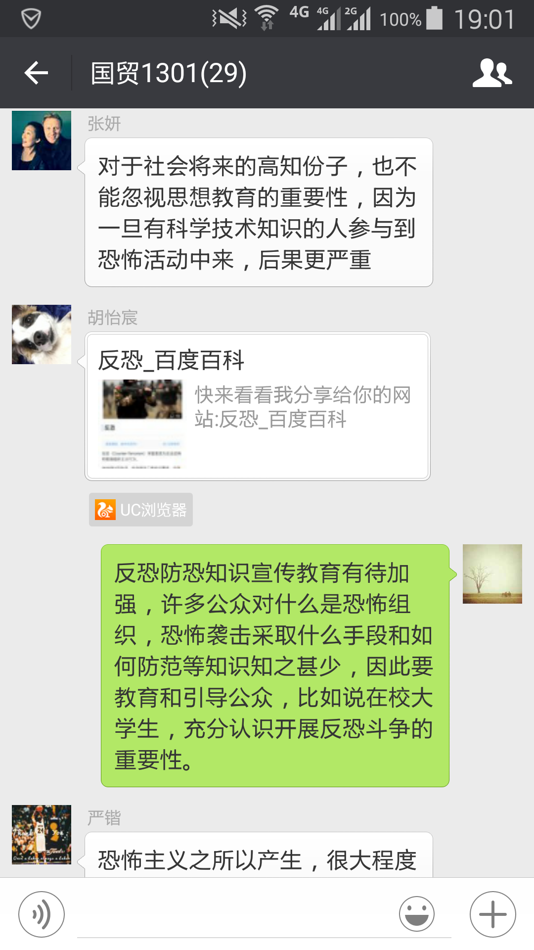 为了让同学们充分认识反恐防暴与自我保护的重要性,树立防范意识,增强自我保护能力,国贸1301班于4月14日晚7点进行了一次以“反恐教育”为主题的微信线上班会活动。