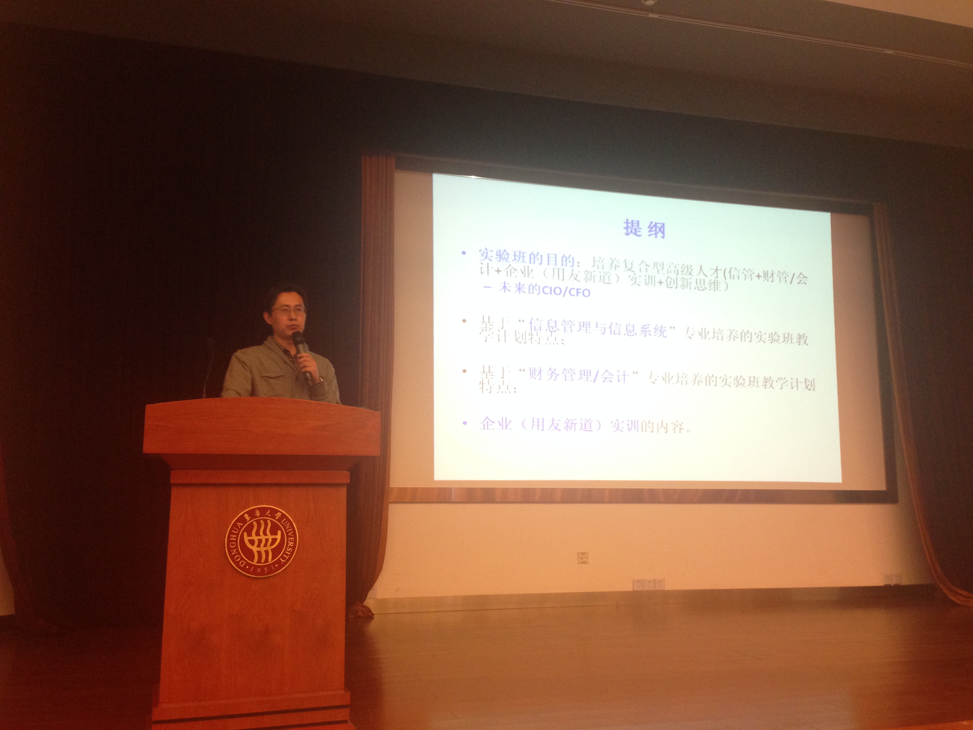 信管系主任为同学们详细地介绍了管理信息化实验班的教学计划。开设实验班的目的是要培养复合型高级人才(信管+财管/会计+企业(用友新道)实训+创新思维),面向新时代企业对于这种人才的大量需求,打造未来的CIO/CFO。老师分别从两大类专业培养的方面为我们介绍了实验班教学计划特点:分别是基于“信息管理与信息系统”、“财务管理/会计”,还有关于企业(用友新道)实训的内容。 这次实验班招收的学生人数是45人,老师希望大家都可以踊跃报名,一旦开始学习就要坚持把这套完整的知识体系学完。这将是一个三方合作教学的培训计划,企业(用友新道)教师、信管专业教师还有会计专业教师会一起参与到教学过程中,并将对同学们的学习实践表现进行考核。实训时间在日常学期周末(大约从第十一周周末开始),还有暑假的集训(社会实习结束后的一两周),总共560个学时。 同学们可以根据实验班对于自己专业的教学计划安排,选修教学大纲内的相关课程。因为横跨了两种专业,所以同学们在实验班中还将学习很多补充课程,这些课程的学分是免费的,而且在课程结束之后可以通过向教务处申请的方式,抵充6个学分的专业选修课。参加管理信息化实验班需要同学们有提高自身综合能力的意愿,并且愿意在课下投入很多的时间和精力,能够踏踏实实坚持完成所有的课程。目前信息化水平越来越高,企业对于员工的要求已经不仅仅局限于理解会计的借贷或者停留在手工记账上,更多地需要员工可以运用信息化软件实现管理层面的工作。 张丹老师为同学们介绍了用友公司,目前有很多企业的会计软件都是由用友公司开发维护的,所以用友的认可雇主非常多。用友与东华大学的合作也有很长时间了。在实验班课程结束之后,表现优秀的同学可以获得用友的能力认证,这也为同学们日后顺利进入企业、会计师事务所工作打下了不错的基础。