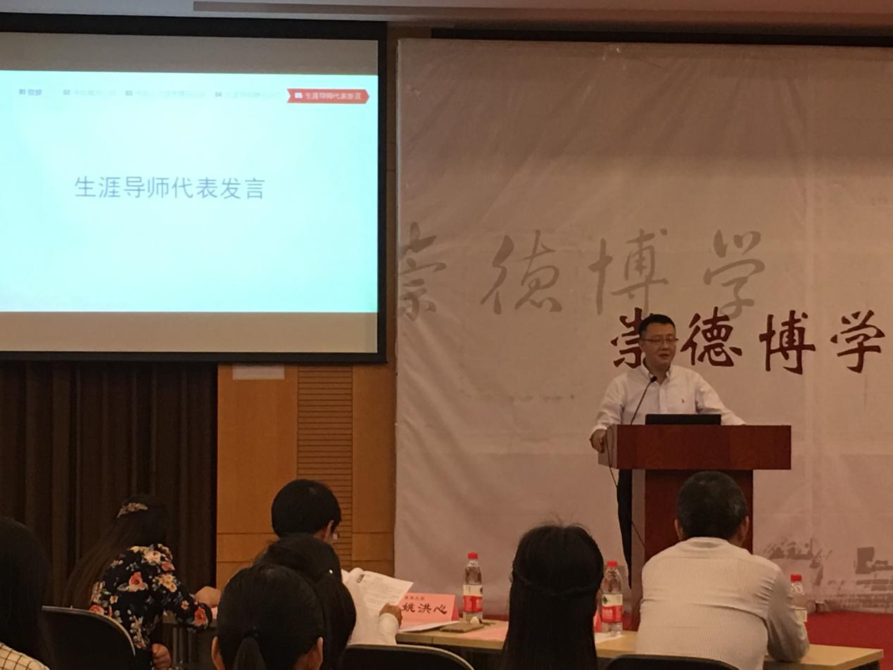 接下来是生涯导师代表——东方花旗证券投资银行部执行总经理葛绍政先生发言。葛绍政先生作为东华大学的校友,对在座的同学们提出了三点建议。首先,要做一个善良的人;其次,要提高自己的学习能力;最后,要有团队合作精神。同时,他也提到在国际化和信息化的今天,同学们要提高语言能力以及计算机能力,为未来成为各行业的精英做准备。