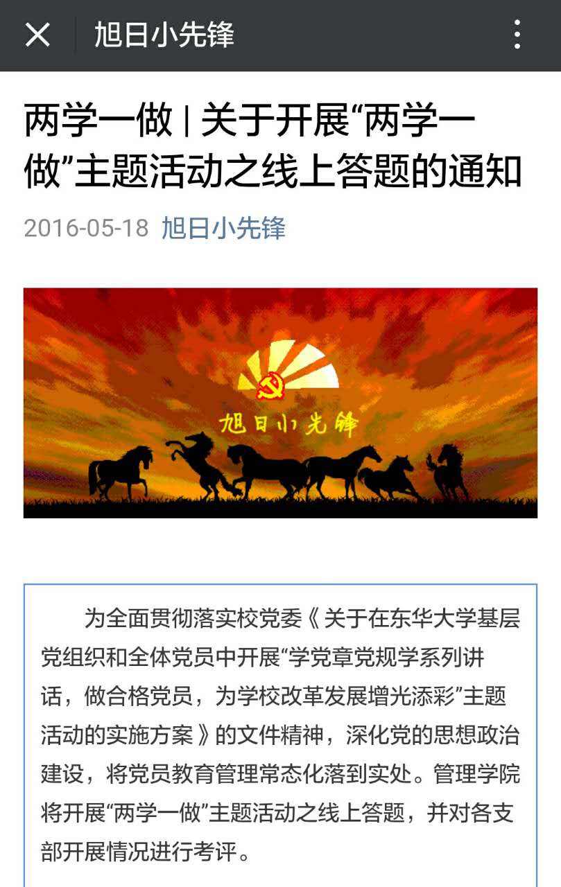 为全面贯彻落实校党委《关于在东华大学基层党组织和全体党员中开展“学党章党规,学习系列讲话,做合格党员,为澳門漁人码头 改革发展增光添彩”主题活动的实施方案》的文件精神,深化党的思想政治建设,将党员教育管理常态化落到实处。从5月10日起,澳門漁人码头 开展了一系列的“两学一做”主题活动,围绕“学”开展了党章党规线上答题、视频学习课程、创新党课、党员思想小结、先锋讲坛等活动,围绕“做”则主要以开展五项工程以及发挥学生党员先锋模范作用为主。