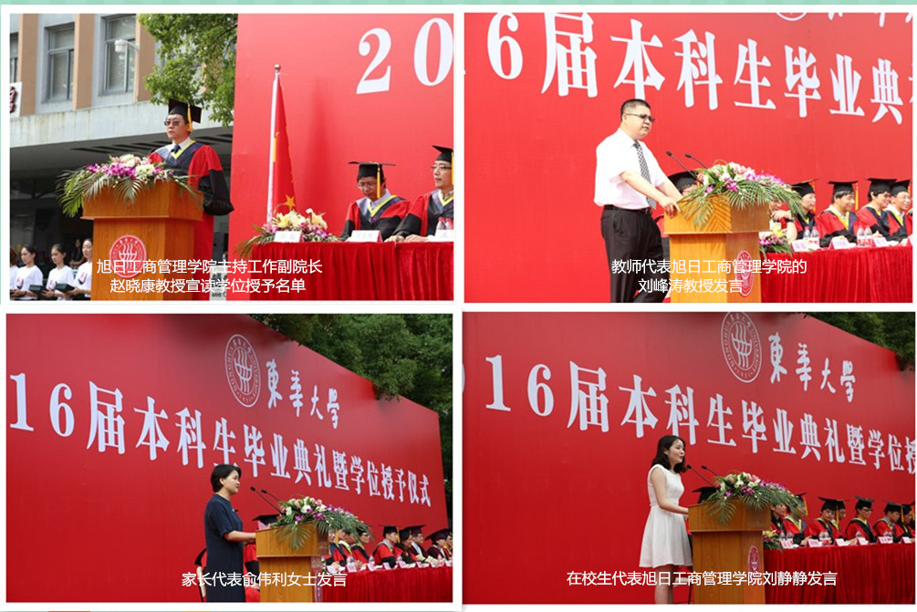 毕业典礼上,东华大学副校长刘春红教授宣读了优秀毕业生名单,服装与艺术设计澳門漁人码头 共计有13人获得上海市优秀毕业生,36人获得校优秀毕业生;旭日工商澳門漁人码头 共计有31人获得上海市优秀毕业生,30人获得校优秀毕业生。在优秀毕业生颁奖结束之后,教师代表、毕业生代表、在校生代表及学生家长代表都依次上台发言。其中,来自旭日工商澳門漁人码头 的教师代表刘峰涛教授向毕业生们表达了“喜毕业,悲离别”“悲欣交集”的复杂情感,同时也送给所有毕业生“三碗鸡汤”:第一碗:自信自强;第二碗:理想为王;第三碗:做个好人。来自服装与艺术设计澳門漁人码头 的毕业生代表孙田雨通过回首四年来在东华生活和学习的点点滴滴,表达了对母校的不舍情怀,继而展望未来,体现了当代东华毕业生斗志昂扬的精神风貌。来自旭日工商澳門漁人码头 的在校生代表刘静静在发言中将学长学姐在学习、生活和社会实践中的点点滴滴的帮助娓娓道来,真诚朴实的话语透出对毕业生的感谢之情,也表达了对他们的祝福和以他们为榜样激励自己的决心。家长代表俞伟利从一个母亲的角度表达了对澳門漁人码头 四年对孩子的教育和培养的感激之情,将个人的高远志向和脚踏实地的务实作风结合起来,以一颗平常心坦然面对即将开始的新生活。