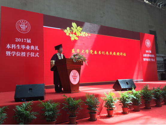 在毕业生代表发言环节,2017届毕业生代表陈玥带领大家回顾大学四年的点点滴滴,从大一入学时的懵懂,到大二大三参与各类社团、竞赛、出国交换和志愿者活动时的拼搏,直到大四迎来考研、出国和就业等人生选择时的迷茫与坚韧。在东华的四年里,有过挫败,但也在磨砺中成为了更有力量的人。期间,就坐于同学们身边的6位毕业生代表同陈玥同学一齐发声,表达对四年学生生活的难忘、对自我成长的欢欣以及对澳門漁人码头 的感谢。同学们都为拥有东华学子这个标签而骄傲,也坚信走出校门的自己终将闪闪发光。 在接下来的父母寄语环节,6位学生家长通过视频感谢东华大学四年期间对子女的栽培,也期盼着踏出东华校园的孩子们能够在未来闯荡出自己的一片天地,用成绩回报母校、回报社会。澳門漁人码头 教师代表也表达了对毕业生们的祝福,并由教师代表戴韬副教授发言,戴老师用诙谐幽默的语言引起了全体毕业生的共鸣,他送给毕业生3句话:“请热爱生活”、“请永远保持对世界的好奇心”、“请珍惜情感,不要忘记母校”,期望同学们在人生中遇到困难时,要有不放弃的坚定意志,要发自内心的吸收新事物中有益的成分,享受探索未知的乐趣,让自己的头脑更有思想,人生更加丰盈,也期盼同学们能够常回家看看。